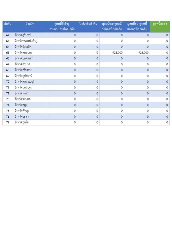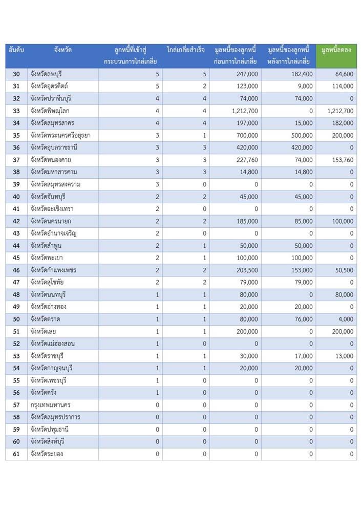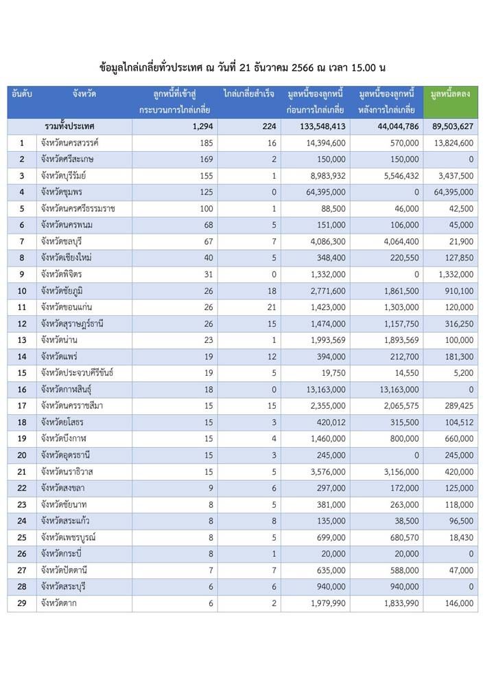 “สำหรับข้อมูลการไกล่เกลี่ยหนี้นอกระบบทั่วประเทศ พบว่ามีลูกหนี้เข้าสู่กระบวนการไกล่เกลี่ยแล้ว 1,294 ราย ไกลเกลี่ยสำเร็จ 224 ราย มูลหนี้ของลูกหนี้ก่อนไกล่เกลี่ย 133.548 ล้านบาท หลังการไกล่เกลี่ย 44.044 ล้านบาท มูลหนี้ลดลง 89.503 ล้านบาท ซึ่งมีจังหวัดที่สามารถนำลูกหนี้เข้าสู่กระบวนการไกล่เกลี่ยได้มากที่สุด คือ จังหวัดนครสวรรค์ โดยมีลูกหนี้ที่เข้าสู่กระบวนการไกล่เกลี่ย 185 ราย ไกล่เกลี่ยสำเร็จ 16 ราย มูลหนี้ของลูกหนี้ก่อนไกล่เกลี่ย 14.394 ล้านบาท หลังการไกล่เกลี่ย 5.7 แสนบาท ทำให้มูลหนี้ของพี่น้องประชาชนในจังหวัด ลดลงมากถึง 13.824 ล้าน
