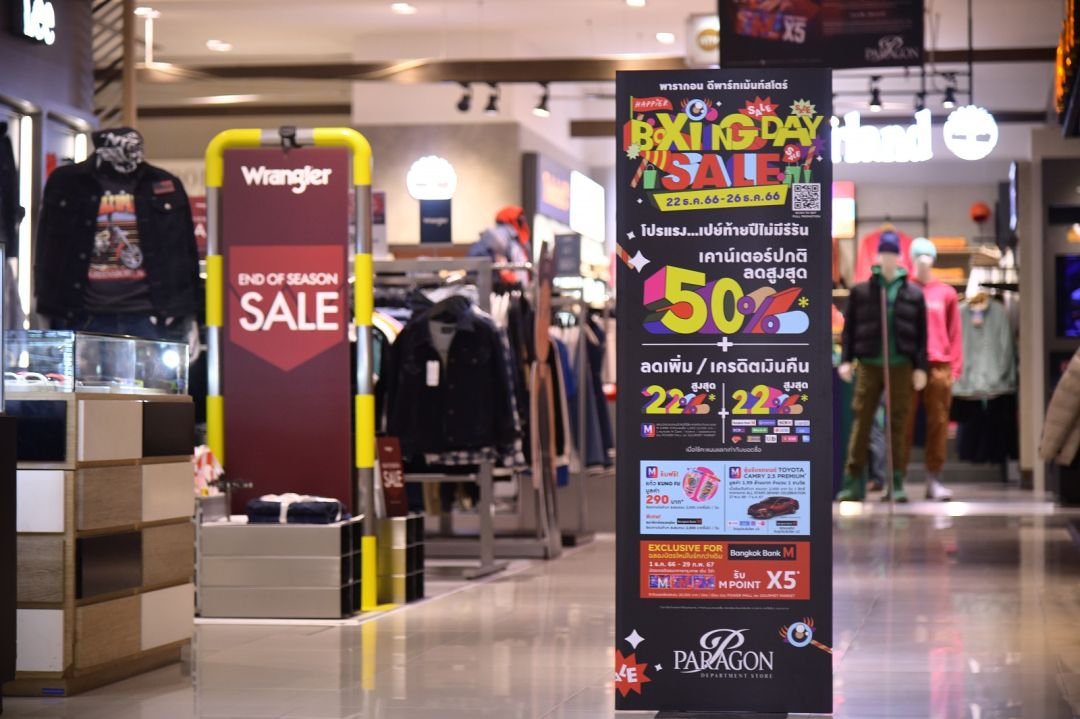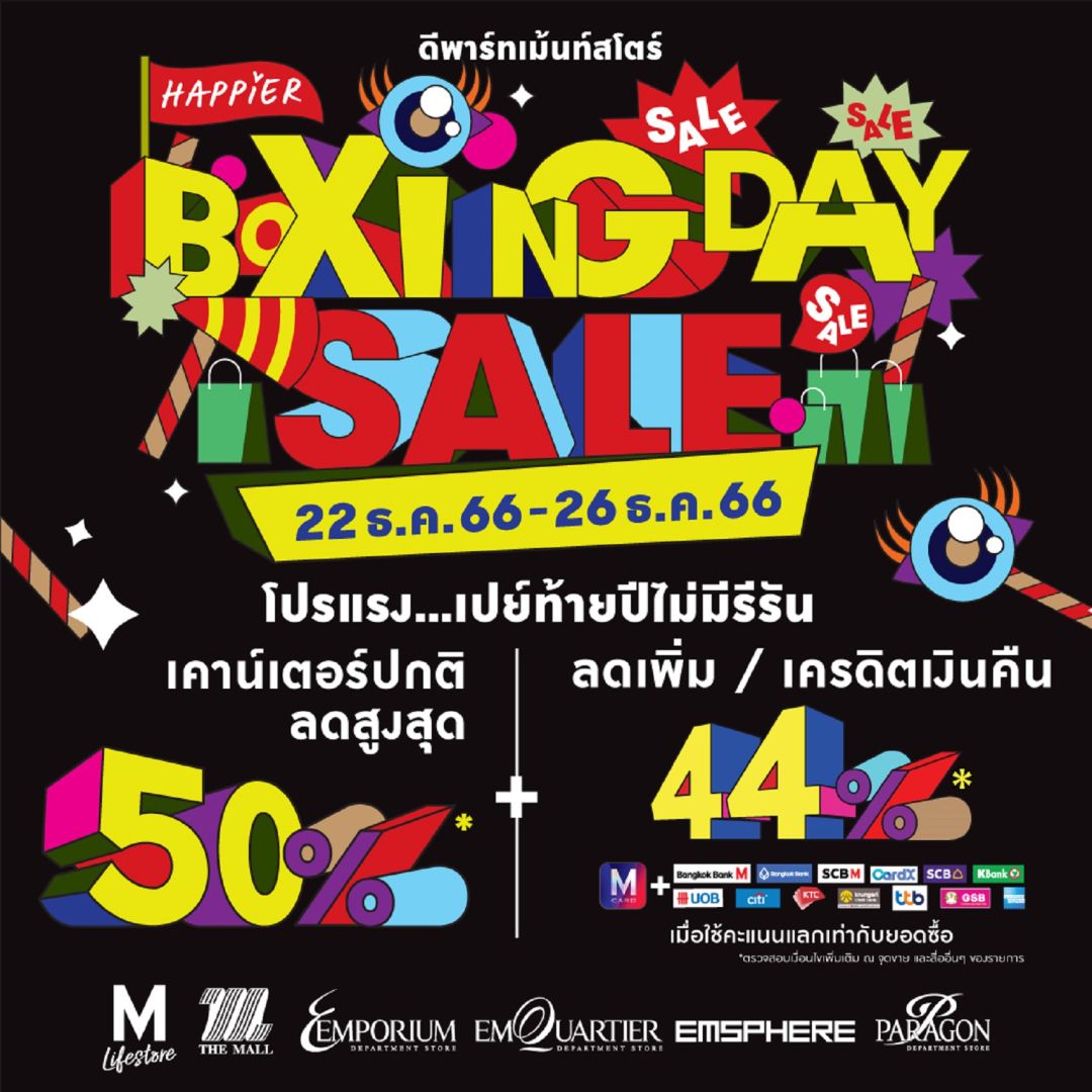 ห้างสรรพสินค้าเดอะมอลล์ และ เดอะมอลล์ไลฟ์สโตร์ ทุกสาขา, เอ็มโพเรียม, เอ็มควอเทียร์, เอ็มสเฟียร์ และ พารากอน ดีพาร์ทเม้นท์สโตร์ จัดแคมเปญพิเศษส่งท้ายปี“Boxing Day Sale” โปรแรง…เปย์ท้ายปีไม่มีรีรัน ระหว่างวันที่22 – 26ธันวาคม 2566ตลอด 5วันเต็ม มอบของขวัญแทนใจ พบสินค้าเคาน์เตอร์ปกติลดสูงสุด 50%สมาชิกบัตรM Cardและลูกค้าบัตรเครดิตที่ร่วมรายการแลกรับส่วนลดเพิ่ม / เครดิตเงินคืน รวมสูงสุด 44%