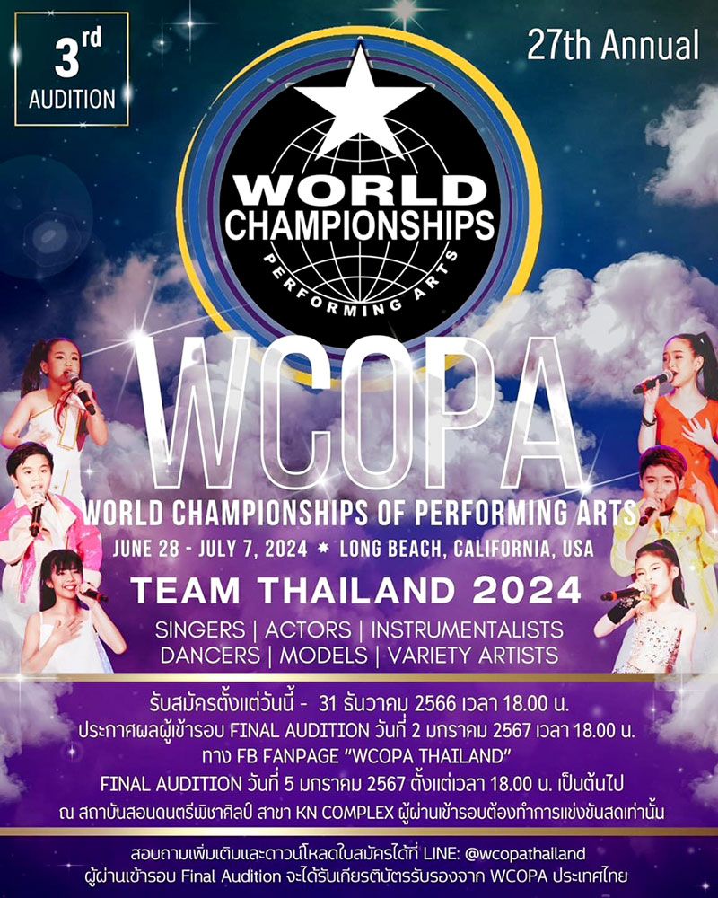 กติกาการออดิชั่นตัวแทนประเทศไทยผู้สมัครดาวน์โหลดใบสมัครทาง Line : @wcopathailand หรือกด https://lin.ee/482cQbaPA โดยกรอกข้อมูล พร้อมส่งคลิปวีดีโอความสามารถของตนเองไม่เกิน 1 นาที จำนวน 3 ประเภท และในคลิปวีดีโอจะต้องแสดงให้เห็นความสามารถของผู้เข้าแข่งขันในด้านต่างๆ อย่างชัดเจน ผู้สมัครส่งคลิปความสามารถ 3 คลิป คลิปละไม่เกิน 1 นาที และรายละเอียดอื่นๆ ได้ถึงวันอาทิตย์ที่ 31 ธันวาคม 2566 เวลา 18.00 น. ประกาศผลผู้ผ่านเข้ารอบสุดท้ายในวันอังคารที่ 2 มกราคม 2567 เวลา 18.00 น. ทางหน้าเพจเฟซบุ๊ก “WCOPA Thailand” Final Audition วันศุกร์ที่ 5 มกราคม 2567 เริ่มเวลา 18.00 น เป็นต้นไปโดยผู้ผ่านเข้ารอบจะต้องทำการแข่งขันสดเท่านั้น ที่สถาบันสอนดนตรีพิชาศิลป์ สาขา KN Complex โอกาสที่จะสร้างชื่อเสียงให้กับประเทศและเส้นทางสู่การเป็นนักร้องมาถึงแล้ว รีบสมัครกันนะจ๊ะ