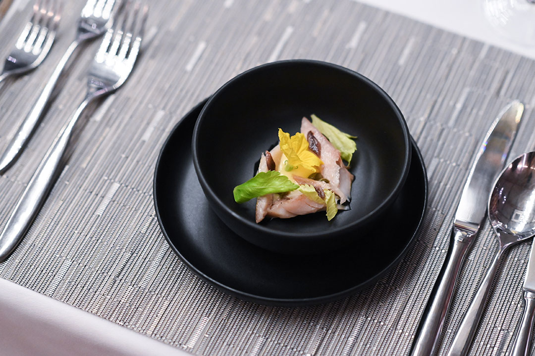 จานแรก — อามูส บุช จานเรียกน้ำย่อย เชฟนำเมนูคลาสสิคของแคว้นพีดมอนท์ “วิเทลโล ทอนนาโด (Vitello Tonnato)” ที่ทำจากเนื้อลูกวัวและปลาทูน่า มาปรับแต่งเป็นเมนูปลาล้วน โดยใช้ปลาแมคเคอเรลเนื้อแน่นแทนปลาทูน่า เสิร์ฟพร้อมซอสครีมสูตรพิเศษรสกล่มกล่อม ออนท็อปด้วยแอนโชวีและเคเปอร์