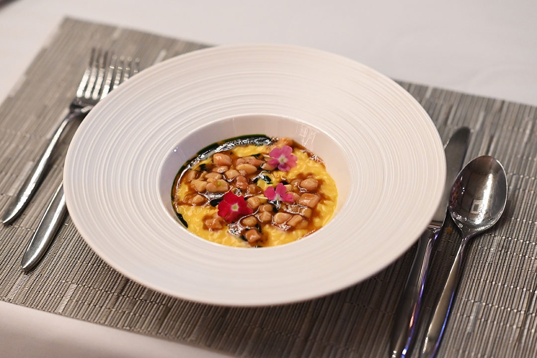 จานที่ 3 – รีซอตตโต เมนูสุดคลาสสิคของอิตาลี เชฟสร้างสรรค์จานนี้ให้มีรสชาติเข้มข้นแปลกใหม่ โดยนำ Cremona มัสตาร์ดที่มีรสเผ็ดหวานเข้มข้นมาเป็นส่วนผสมของซอสรีซอตโต เสิร์ฟคู่กับน้ำสต็อกเคี่ยวจากไขกระดูกวัว (bone marrow) หอมอร่อย ตัดรสด้วยผักดองชิ้นเล็ก