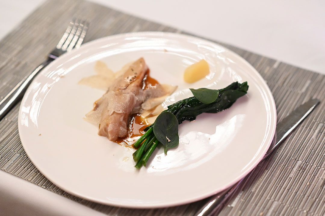 จานที่ 4 – อกไก่เบรส (Bresse) จากฝรั่งเศส เสิร์ฟกับซอสฟัวกราส์ แอปเปิลชิ้นเล็ก และผักโขมฝรั่ง ไฮไลท์ด้วยด้วยทรัฟเฟิลขาวจากอัลบา (Alba) ฝานบางๆ ด้านบน