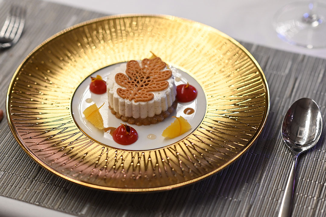 จานที่ 5 – ขนมหวาน เค็กชีบูสครีม (Chiboust Cream) กับเฮเซลนัท เชฟเลือกใช้เฮเซลนัท (Hazelnut) “ราชินี” ถั่วจากแค้วนพีดมอนท์ เป็นส่วนผสม เสิร์ฟมากับซอสส้มผสมเหล้าหวานแกรนด์ มาเนียร์ (Grand Marnier) รสละเมียดจากฝรั่งเศส