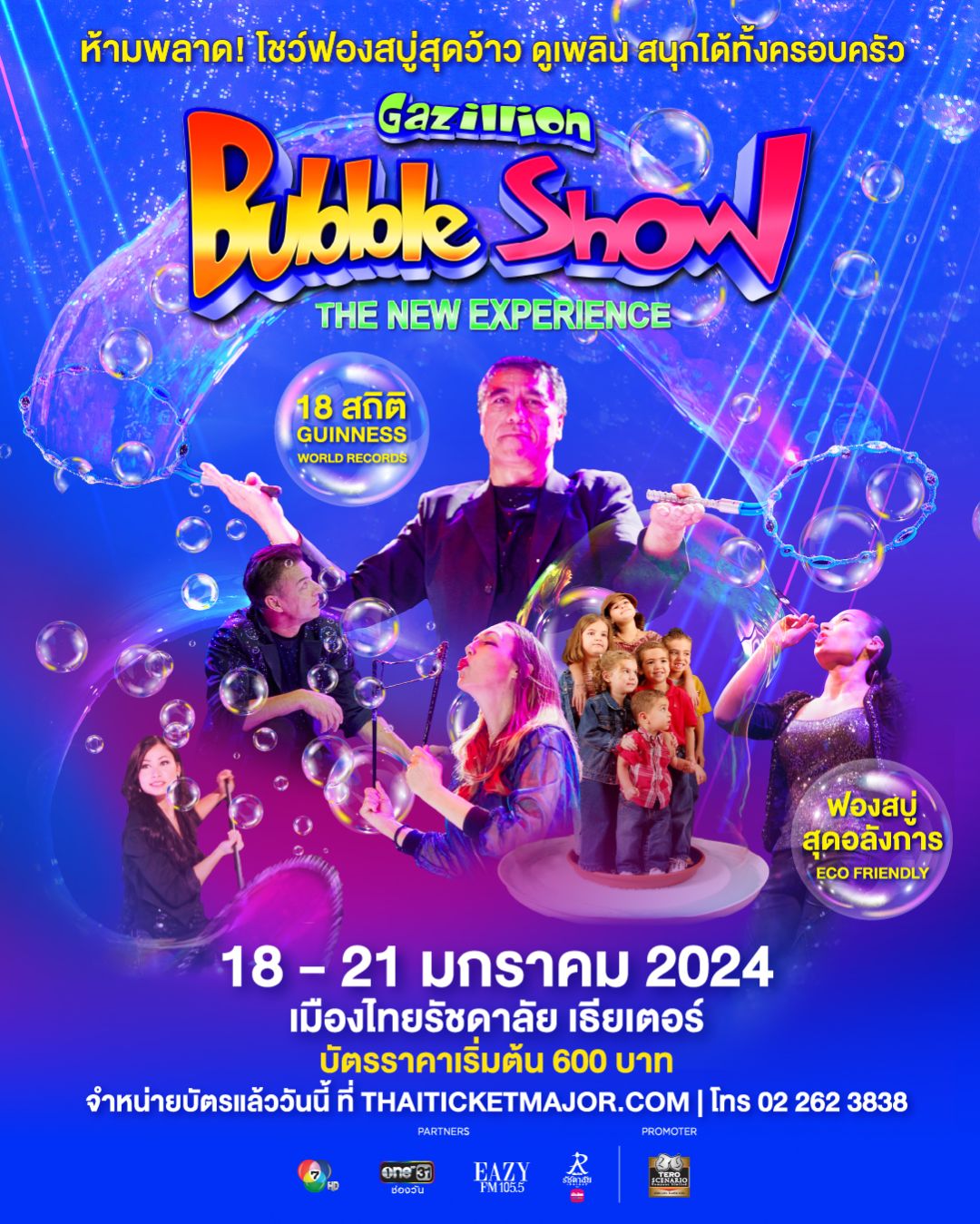 ช่วงเวลาแห่งความสุขของทุกคนในครอบครัวกำลังจะเกิดขึ้นอีกครั้งพร้อมปรากฎการณ์ความสนุกที่ทุกคนจะได้สัมผัสกับโชว์ฟองสบู่สุดยิ่งใหญ่และน่าทึ่งที่สุด “Gazillion Bubble Show” (กาซิลเลี่ยน บับเบิ้ล โชว์)ที่ ฟาน ยาง (Fan Yang) ปรมาจารย์ฟองสบู่เจ้าของสถิติโลก กินเนสส์ เวิลด์ เรคคอร์ด (Guinness World Record) หลายรางวัลและเหล่าศิลปินสมาชิกในครอบครัวอานา (Ana), เดนี (Deni), เมโลดี (Melody)และ จาโน(Jano)ได้ร่วมกันเนรมิตสร้างสรรค์โชว์ขึ้นมาใหม่ และจะพาทุกคนก้าวเข้าสู่โลกแห่งฟองสบู่ยักษ์ในแบบอินเตอร์แอคทีฟที่ผู้ชมสามารถร่วมสนุกได้ทุกโมเมนต์แบบใกล้ชิด ปลอดภัยด้วยฟองสบู่ออร์แกนิคไร้สารพิษที่ลอยกระจายทั่วทั้งฮอลล์ พร้อมโปรดักชั่นสุดอลังการ ทั้ง แสง สี เอฟเฟกซ์เลเซอร์ตระการตา