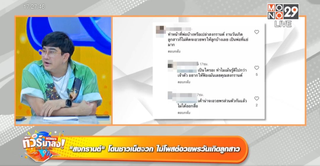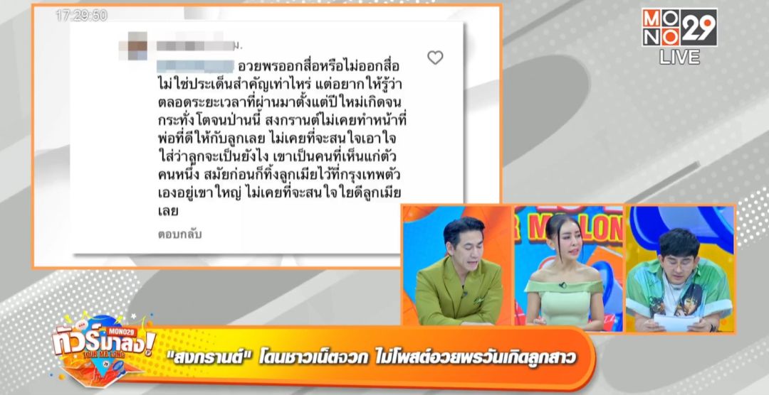ต่อด้วยประเด็นทัวร์ลงกับอดีตสามีของสาว แอฟ-ทักษอรภักดิ์สุขเจริญอย่างสงกรานต์เตชะณรงค์กับกรณีดราม่ารับต้นปี เมื่อวันที่ 1 มกราคมที่ผ่านมา เป็นวันเกิดของลูกสาวน้องปีใหม่ โดยแม่แอฟ ก็ได้โพสต์คลิปอวยพรลูกสาว แต่ด้าน พ่อสงกรานต์ ไม่ได้มีการโพสต์ถึงแต่อย่างใด ทำเอาชาวเน็ตบางรายจวกยับ ว่าทำหน้าที่พ่อบ้างหรือไม่ ลากยาวไปจนถึงประเด็นการเลี้ยงดูและส่งเสียที่ไม่มีมาให้เห็นในระยะเวลาที่ผ่านมารวมถึงประโยคที่บอกว่า เป็นพ่อที่แย่มาก ด้านพิธีกร พชร์ ขอออกตัวแทนว่าต่อให้เป็นคนสาธารณะ ก็ต้องให้เขามีความเป็นส่วนตัวบ้าง“เขาเป็นพ่อลูกกันเขาจะอะไรก็เรื่องของเขา ไม่ใช่อยากจะด่าใครก็ด่า ที่คอมเม้นท์เนี่ยอย่ามาบอกรู้เท่าไม่ถึงการณ์นะ โตขนาดนี้แล้ว”พิธีกร เป็กกี้ เสริมอีกว่าทุกเรื่องที่เกิดขึ้น เราอาจจะไม่ได้โพสต์ลงทั้งหมดก็ได้ แต่พิธีกร พชร์ ก็ยังไม่จบยังเตือนสติชาวเน็ตอีกว่าเขาฟ้องได้ “ฟ้องเลยสงกรานต์ ทำให้ดูเป็นตัวอย่างหน่อย คนที่ดูเหมือนรู้ลึกแต่ไม่รู้จริง เขาจะอวยพรหรือไม่อวยพรเราก็ไม่มีสิทธิ์ไปยุ่งเรื่องพ่อกับลูกเขา”พิธีกร เพชรจ้า เผยว่าตนเคยมีโอกาสสอบถามทนายในเคสแบบนี้ฟ้องได้ประมาณหนึ่งแสนบาท “เพราะข้อความเหล่านี้คือข้อความที่เป็นบ่อนทำลายคน”จะเม้นท์จะเม้าท์ใคร ระวังหมายศาลตามไปหาถึงบ้านกันนะด้วยนะเออ…