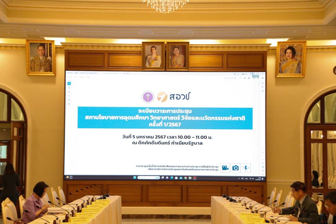 5 มกราคม 2567 ณ ตึกภักดีบดินทร์ ทำเนียบรัฐบาล นายเศรษฐา ทวีสิน นายกรัฐมนตรี เป็นประธานการประชุมสภานโยบายการอุดมศึกษา วิทยาศาสตร์ วิจัยและนวัตกรรมแห่งชาติ (สภานโยบาย) ครั้งที่ 1/2567 โดยมีนายอนุทิน ชาญวีรกูล รองนายกรัฐมนตรีและ รมว.มหาดไทย (มท.) รองประธานคนที่หนึ่ง และ นางสาวศุภมาส อิศรภักดี รมว.การอุดมศึกษา วิทยาศาสตร์ วิจัยและนวัตกรรม (อว.) รองประธานคนที่สอง พร้อมด้วยรัฐมนตรี ผู้บริหารจากกระทรวง หน่วยงานต่าง ๆ และผู้ทรงคุณวุฒิ เข้าร่วมประชุมอย่างพร้อมเพรียง