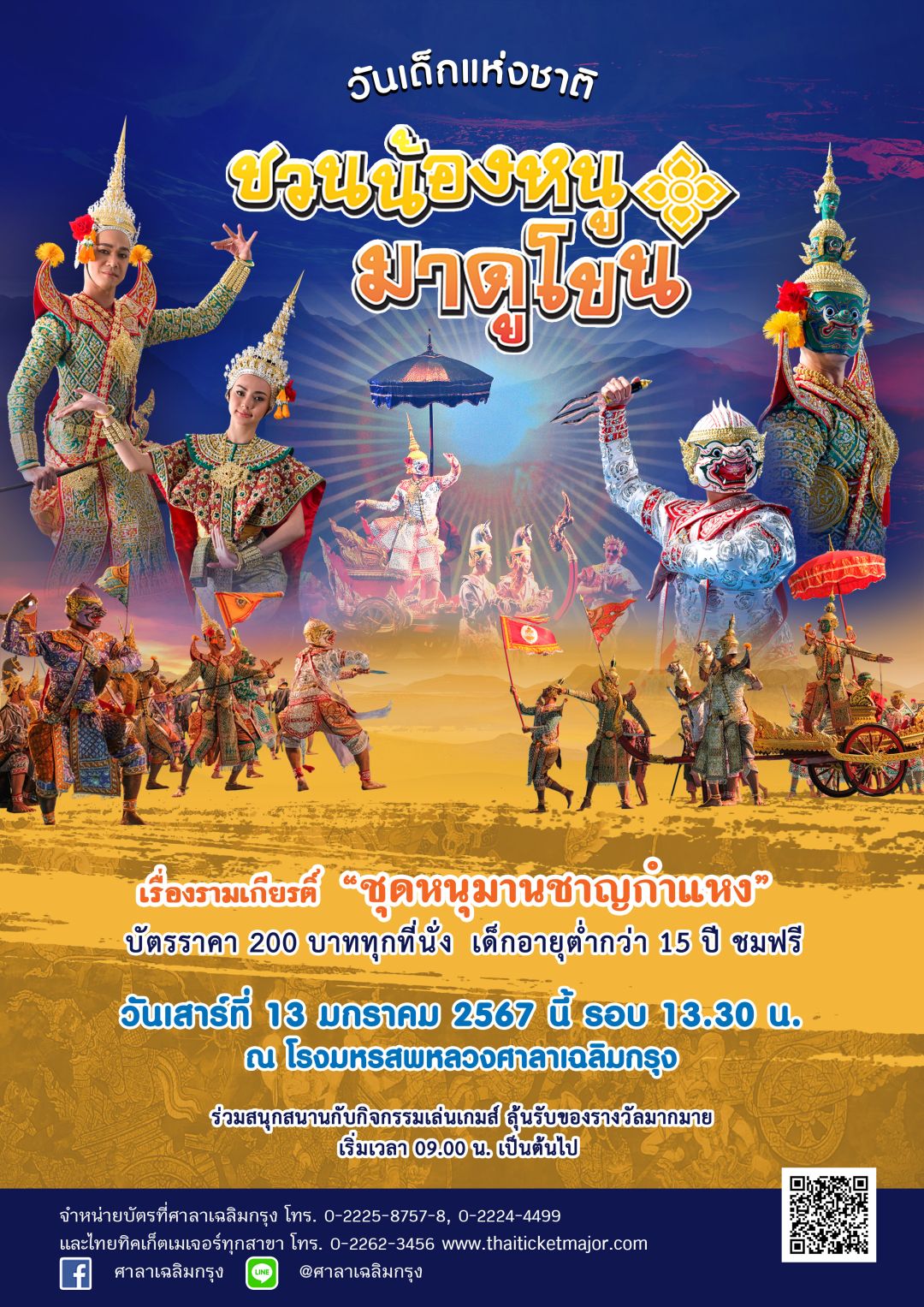 โรงมหรสพหลวงศาลาเฉลิมกรุงเปิดการแสดงปฐมฤกษ์แห่งปี ขอเชิญชมการแสดงโขนเนื่องในวันเด็กแห่งชาติ ประจำปี 2567 “ชวนน้องหนู…มาดูโขน” ชุดหนุมานชาญกำแหง เป็นของขวัญให้เด็กๆ ได้รับชมการแสดงโขน โดยไม่เสียค่าใช้จ่ายในวันเสาร์ที่ 13มกราคม 2567 นี้ รอบ 13.30 น.ณ โรงมหรสพหลวงศาลาเฉลิมกรุงและเชิญชวนน้องหนูร่วมสนุกไปกับกิจกรรมเล่นเกมส์ ตอบคำถามรับของขวัญมากมาย ตั้งแต่เวลา 09.00 น. เป็นต้นไป ณ บริเวณด้านหน้าศาลาเฉลิมกรุง ก่อนพากันเข้าชมการการแสดงโขนในช่วงบ่ายโดยสอดแทรกเกร็ดความรู้เรื่อง “โขน”ให้กับเด็กๆ ไปพร้อมกับความบันเทิง
