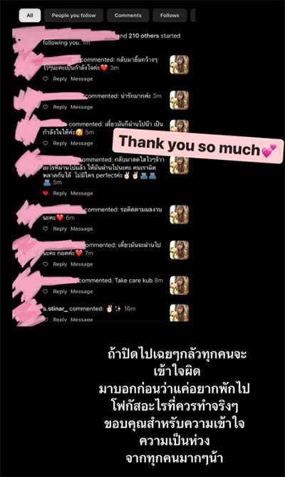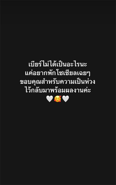 ล่าสุด เจ้าตัวไม่ปล่อยให้รอนาน โพสต์ข้อความหายสงสัยว่า… “เบียร์ไม่ได้เป็นอะไรนะ แค่อยากพักโซเชียลเฉยๆ ขอบคุณสำหรับความเป็นห่วง ไว้กลับมาพร้อมผลงานค่ะ”