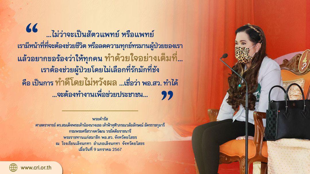 ในการนี้ ทรงนำสมาชิก พอ.สว. ร่วมขับร้องเพลงพระนิพนธ์ “เลือดหยดเดียว” พร้อมพระราชทานพระดำรัสเพื่อเป็นแนวทางในการปฏิบัติตนและปฏิบัติงานอย่างรอบคอบ และมีสติอันก่อให้เกิดประโยชน์สูงสุดแก่ส่วนรวม และประเทศชาติ โดยขอเชิญพระดำรัสในโอกาสที่ได้เสด็จฯไปทรงเยี่ยมหน่วยแพทย์ พอ.สว. ประจำจังหวัดยโสธร เมื่อวันที่ 9 มกราคม พุทธศักราช 2567 ณ โรงเรียนเลิงนกทา อำเภอเลิงนกทา จังหวัดยโสธร ความตอนหนึ่งว่า… “ …ไม่ว่าจะเป็นสัตวแพทย์ หรือ แพทย์ เราก็ต้องมีหน้าที่ที่จะต้องช่วยชีวิต หรือลดความทุกข์ทรมานผู้ป่วยของเรา แล้วอยากขอร้องว่าให้ทุกคนทำด้วยใจอย่างเต็มที่…เราต้องช่วยผู้ป่วยโดยไม่เลือกที่รักมักที่ชัง คือ เป็นการทำดีโดยไม่หวังผล …เชื่อว่า พอ.สว. ทำได้ …จะต้องทำงานเพื่อช่วยประชาชน…”