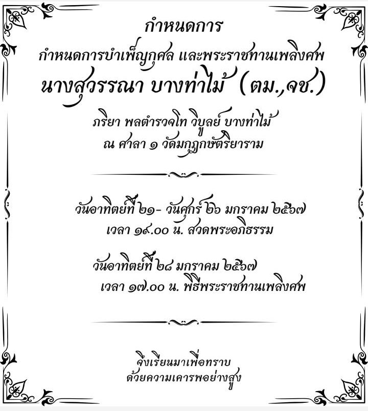 ข่าวเศร้า พล.ต.ท.วิบูลย์ บางท่าไม้ สูญเสีย นางสุวรรณา บางท่าไม้ ภริยา โดยกำหนดการบำเพ็ญกุศล และพระราชทานเพลิงศพ นางสุวรรณา บางท่าไม้ (ตม,จช.) ภริยา พลตำรวจโท วิบูลย์ บางท่าไม้ ณ ศาลา 1 วัดมกุฏกษัตริยาราม