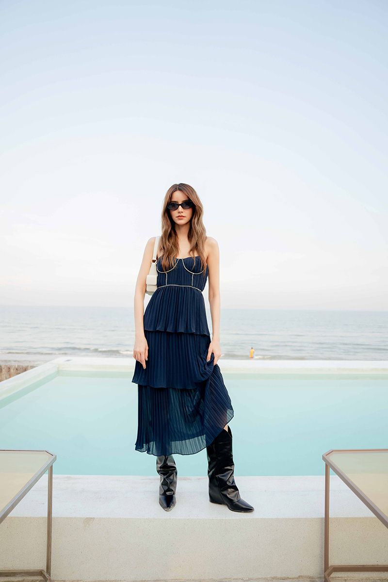 โดยไฮไลท์ในงานการเดินแฟชั่นโชว์คอลเลกชั่นล่าสุด สปริง 2024 Beach Destination ที่มากับธีมลุคที่หลอมรวมความเป็นฤดูใบไม้ผลิที่มีชีวิตชีวาและแฝงไปด้วยความละเอียดอ่อน เข้ากับความสง่างามของผู้หญิงที่ปรากฏตัวในลุคสุดหรูท่ามกลางโมเมนต์อันน่าจดจำ เสื้อผ้าในฤดูกาลนี้ตั้งใจสรรสร้างให้ตอบโจทย์ลุคการแต่งตัวในโอกาสสำคัญหรือโมเมนต์สนุกๆโดยมีหัวใจสำคัญอยู่ตรงการบาลานซ์ระหว่างนิยามของคำว่าหรูหราและความชิคเหมาะกับบรรยากาศกลางแจ้งที่สนุกและผ่อนคลาย ผ้าลูกไม้ลายดอกอันประณีตบรรจงได้มาปรากฏอยู่บนไอเทมหลากหลายชิ้นเพื่อสร้างลุคที่ดูมีมิติ กางเกงลูกไม้สีขาวบริสุทธิ์และเสื้อเชิ้ตเข้ากันสามารถเลเยอร์กับบราเล็ตสีขาวทึบด้านในได้อย่างเซ็กซี่ลงตัว ไปจนถึงเสื้อเชิ้ตผ้าลูกไม้สีเบจนู้ดที่มีความโรแมนติกจากดีเทลจับสม็อคโบว์สีม่วงไลแลคประดับที่คอเสื้อ หรือจะเป็นเดรสลูกไม้แขนกุดคอปกที่ดูสมาร์ทและทะมัดทะแมง เหมาะกับโมเมนต์จิบไวน์บนเรือยอร์ชส่วนตัว เดรสสีชมพูช็อกกิ้งพิงค์กับดีเทลซีทรูผ่าด้านข้าง จั๊มป์สูทขาสั้นที่ช่วงบนให้ลุคแบบเสื้อเชิ้ตในสีเขียวสดที่มีความคล่องตัว และชุดเซตสายเดี่ยวและกางเกงขากว้างในดีเทลจับพลีตทั่วทั้งตัว นอกจากนี้ยังมีเดรสสั้นสำหรับปาร์ตี้กลางวันและกลางคืนอย่างมินิเดรสเกาะอกลายจุดสีขาวเข้ารูป และมินิเดรสแขนกุดสีดำแต่งหมุดลายดาวสำหรับยามค่ำคืน