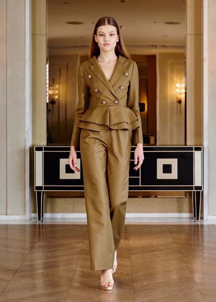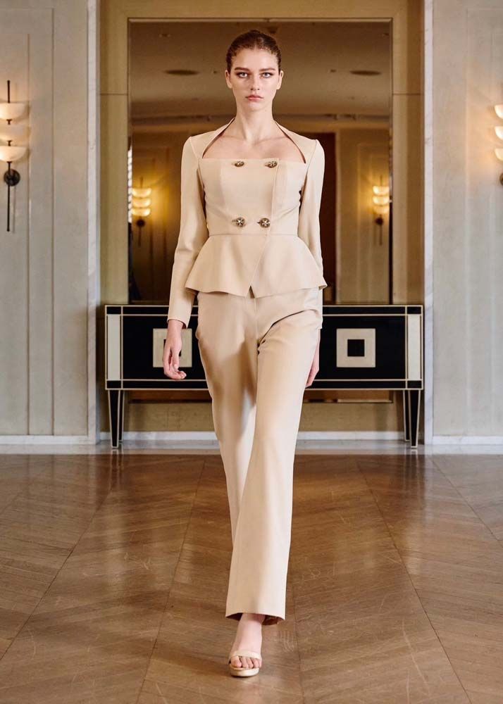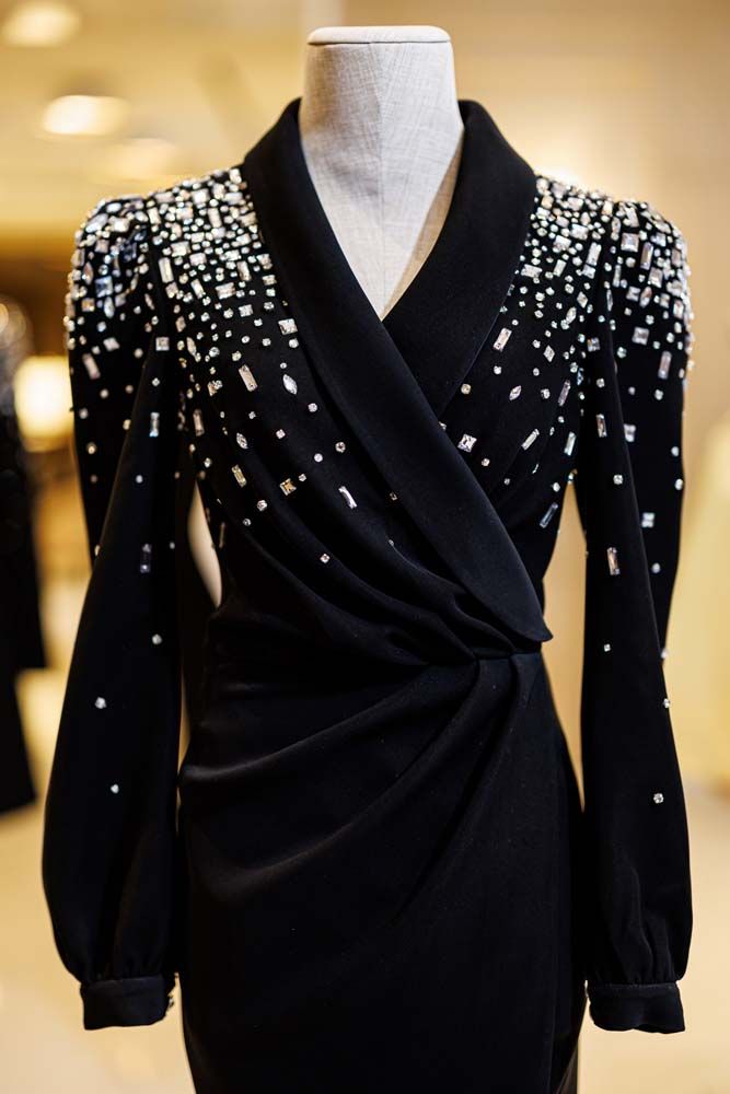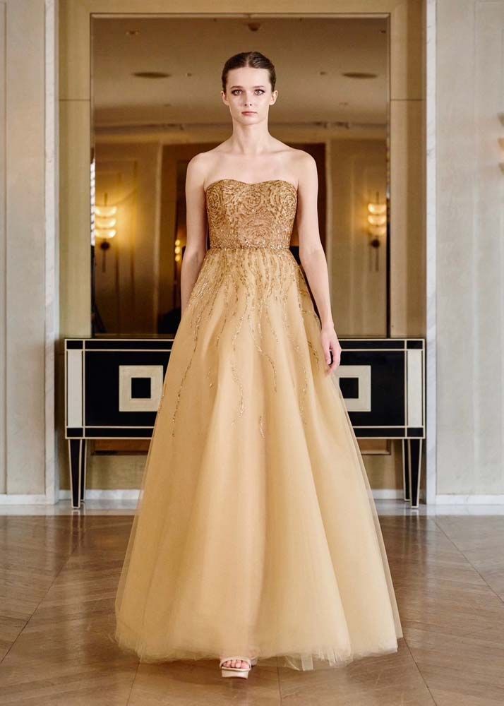 อีกหนึ่งความน่าสนใจคือ ซิลูเอตอันหลากหลายของเนื้อผ้าที่อยู่ทรงมีน้ำหนักไปจนถึงเนื้อผ้าที่บางเบา สวมใส่สบาย เพิ่มมิติลุ่มลึกให้คอลเลคชั่น อาทิ เดรสยาวเกาะอกสีชมพูประดับขนนก เดรสแขนกุดสีขาวปักลวดลายดอกไม้สีเงินประดับขนนก เดรสสั้นแขนยาวสีดำปักคริสตัลช่วงไหล่ สะท้อนถึงแสงไฟประดับระยิบระยับจากทั่วทุกมุมเมืองของกรุงปารีส รวมถึงสีน้ำตาลทองของหอไอเฟลเมื่อกระทบแสงยามเย็น สู่การรังสรรค์เดรสยาวเกาะอกผ้าชีฟองสีทอง ปักเลื่อมลวดลายแสงดวงอาทิตย์