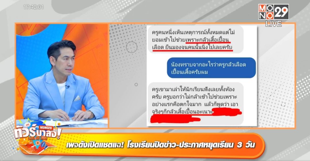ข่าวอันธพาลยังไม่ทันซา ก็มีข่าวร้อนเยาวชนเดือดเพิ่มมาอีก เหตุสลดสะเทือนโซเชียล ในกรณีนักเรียนม.2ใช้มีดปอกผลไม้แทงคอเพื่อนนักเรียนร่วมชั้นเสียชีวิต พิธีกร พชร์เล่าข่าวเปิดปมเด็กที่ก่อเหตุมีการเตรียมการมาก่อน “ตามที่เห็นเขาแชร์กันว่าน้องเตรียมมีดมาก่อเหตุ เพราะทนถูกรีดไถเงินทุกวันไม่ไหว”หลังสอบสวนเด็กผู้ก่อเหตุพบว่าผู้ตายชอบมารีดไถเงินช่วงพักเที่ยงวันละ 20 บาท มีการทำร้ายร่างกายตั้งแต่ 2 อาทิตย์ที่ผ่านมา พิธีกร เพชรจ้า ชี้ประเด็นว่าต้องสืบสวนเพิ่มเติม “เพราะตอนก่อเหตุมีสติ 100 เปอร์เซ็นต์ มันมีทุกโรงเรียนแหละกลุ่มแก๊งคุมโรงเรียน ไถเงิน สมัยผมเรียนก็มี อย่างมากก็แค่ชกกันถ้าเป็นพี่พชร์โดนเป็นผู้ถูกกระทำจะแนะนำอย่างไร”พิธีกร พชร์ แนะนำว่าอย่าเก็บไว้คนเดียว บอกครูบอกพ่อแม่ให้รับรู้“ใกล้ตัวเด็กสุดก็คงเป็นครู แต่ครูก็ต้องฟังเด็กด้วยไม่ใช่ไม่ใส่ใจครูต้องทำให้เด็กเชื่อใจผู้ใหญ่ในโรงเรียนได้” พิธีกร เพชรจ้า เสริมว่าไปฟ้องแล้ววันต่อมาโดนหนักกว่าเดิมจะทำอย่างไร “สมัยนี้ต้องไปร้องสายไหมต้องรอดดีไหม หรือกันจอมพลังไปเลยตอนนี้เขากำลังปราบปรามเด็กสร้างความเดือดร้อนพอดี”