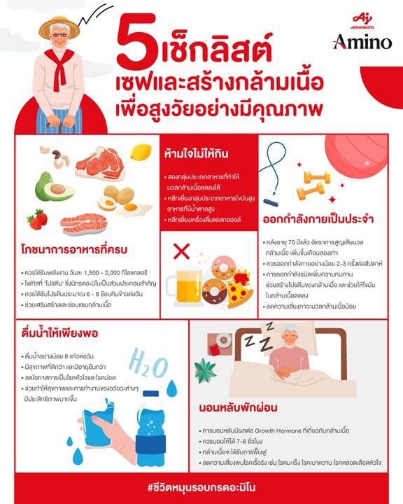 จากข้อมูลข้างต้นทำให้เห็นว่าการมี “กล้ามเนื้อที่แข็งแรง” เป็นหนึ่งในปัจจัยพื้นฐานสำคัญสำหรับผู้สูงวัยซึ่งจะนำไปสู่การมีอายุที่ยืนยาวอย่างมีคุณภาพ โดยการจะไปถึงจุดนั้นได้ต้องอาศัยหลายปัจจัยซึ่งครอบคลุมทั้งเรื่องการกินและการเป็นอยู่ที่ดี ซึ่งเป็นสองสิ่งที่มีความสัมพันธ์ต่อเนื่องซึ่งกันและกัน สำหรับในวันนี้ขอแนะนำ 5 เช็กลิสต์ที่จะช่วยเซฟและช่วยสร้างกล้ามเนื้อให้แข็งแรง เหมาะสำหรับผู้สูงวัย เพื่อเป้าหมายคุณภาพชีวิตที่ดีในอนาคต และเป็นสิ่งที่ทุกท่านสามารถทำได้ จะมีอะไรบ้างมาดูกัน