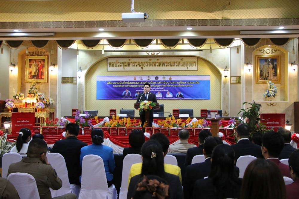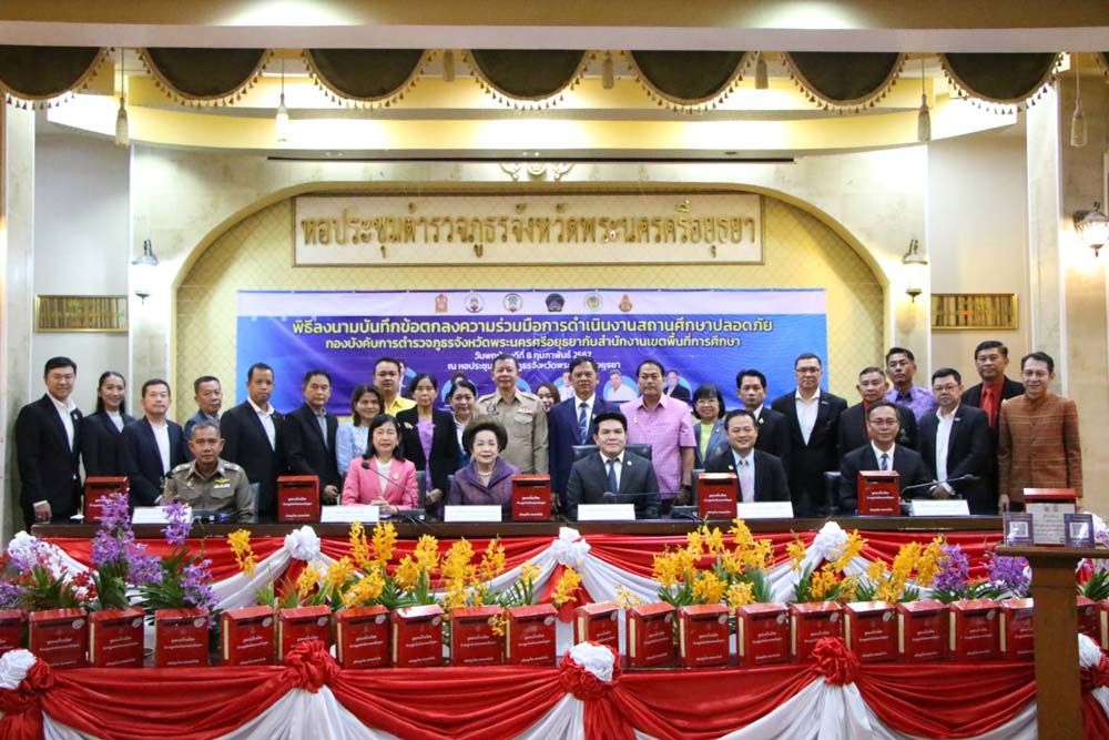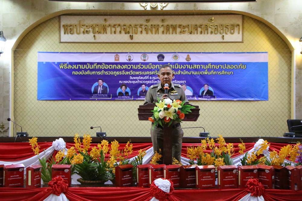 “ผมในฐานะตัวแทนของกระทรวงศึกษาธิการ ขอขอบคุณทุกฝ่าย ทุกหน่วยงาน ที่ได้บูรณาการการทำงานร่วมกันเป็นอย่างดี ผมรู้สึกซาบซึ้งและเห็นความตั้งใจของทุกท่าน ในการช่วยกันดูแลความปลอดภัยของนักเรียน เพราะว่าเด็ก ๆนักเรียนในโรงเรียนก็คือลูกๆของทุกคนในจังหวัดพระนครศรีอยุธยาเช่นกัน สุดท้ายนี้ ผมเชื่อว่าการลงนามในวันนี้จะเป็นการนำร่องให้ทุกจังหวัดได้มีความร่วมมือในลักษณะนี้ด้วยเช่นกัน ซึ่งหลังจากนี้ทางกระทรวงศึกษาธิการ ก็จะจัดทำ MOU ฉบับใหญ่ในภาพรวมระดับกระทรวง ร่วมกับทางสำนักงานตำรวจแห่งชาติ กระทรวงมหาดไทย และหน่วยงานต่างๆ เพื่อให้มีผลไปถึงทั้งประเทศในการช่วยดูแลความปลอดภัยให้กับโรงเรียน เพราะโรงเรียนปลอดภัย นักเรียนปลอดภัย คือความมุ่งหวังของผู้ใหญ่ทุกคน ตามนโยบาย “เรียนดี มีความสุข” ของพลตำรวจเอก เพิ่มพูน ชิดชอบ รมว.ศธ. ที่ให้ความสำคัญกับนักเรียน ครูและบุคลากรทางการศึกษาทุกคนครับ” รมช.ศธ. กล่าว