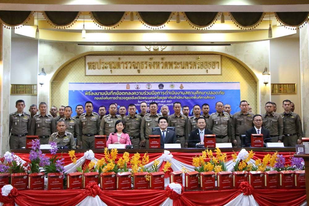 วันที่ 8 กุมภาพันธ์ 2567 นายสุรศักดิ์ พันธ์เจริญวรกุล รัฐมนตรีช่วยว่าการกระทรวงศึกษาธิการ (รมช.ศธ.) เป็นประธานในพิธีลงนามบันทึกข้อตกลงความร่วมมือการดำเนินงานสถานศึกษาปลอดภัย ระหว่าง กองบังคับการตำรวจภูธรจังหวัดพระนครศรีอยุธยา กับ สำนักงานเขตพื้นที่การศึกษา จังหวัดพระนครศรีอยุธยา โดยมี นางสมทรง พันธ์เจริญวรกุล นายกองค์การบริหารส่วนจังหวัดพระนครศรีอยุธยา นายประพันธ์ ตรีบุบผา รองผู้ว่าราชการจังหวัดพระนครศรีอยุธยา พล.ต.ต.โชติวัฒน์ เหลืองวิลัย ผบก.ภ.จังหวัดพระนครศรีอยุธยา นายธีร์ ภวังคนันท์ รองเลขาธิการคณะกรรมการการศึกษาขั้นพื้นฐาน รวมถึงผู้อำนวยการสำนักงานเขตพื้นที่การศึกษาทั้ง 3 เขต ศึกษาธิการจังหวัดพระนครศรีอยุธยา ครูและบุคลากรทางการศึกษา และบุคลากรที่เกี่ยวข้อง เข้าร่วมในพิธี ณ หอประชุมตำรวจภูธรจังหวัดพระนครศรีอยุธยา