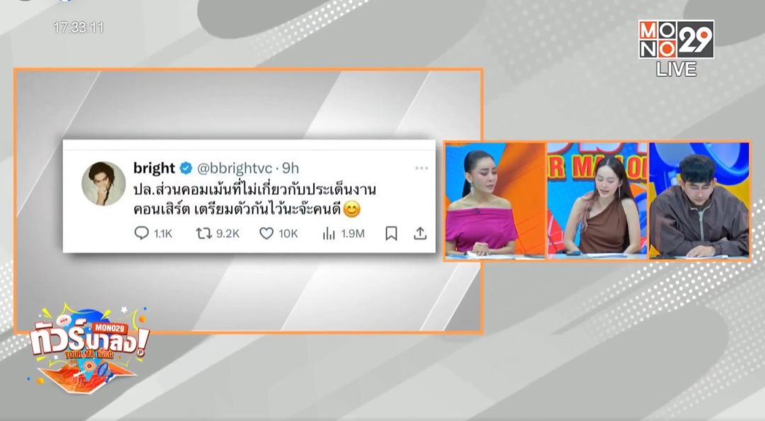 งานนี้ปุ้มปุ้ยพิธีกรสาวออกปากเข้าใจ “เขาตื่นเต้นมันเกิดขึ้นได้อ่ะไบรท์เขาก็มาจากสายการแสดงนึกออกมั้ย ?ไม่ได้เป็นศิลปินขึ้นคอนเสิร์ตบ่อย ๆ” โดย เป็กกี้สวนกลับ “ยังไม่สามารถวิเคราะห์ได้เพราะยังไม่เห็นค่ะแต่เราเข้าข้างผู้ชายอยู่แล้ว (ฮา)” ก่อนที่ทั้งหมดจะกล่าวย้ำใครจะโพสต์วิจารณ์อะไรโปรดระวังกันให้ดี ๆ เพราะหนุ่มไบรท์ทิ้งทายได้แซ่บเหมือนกัน “ปล. ส่วนคอมเม้นท์ที่ไม่เกี่ยวประเด็นงานคอนเสิร์ตเตรียมตัวกันไว้นะจ๊ะคนดี”