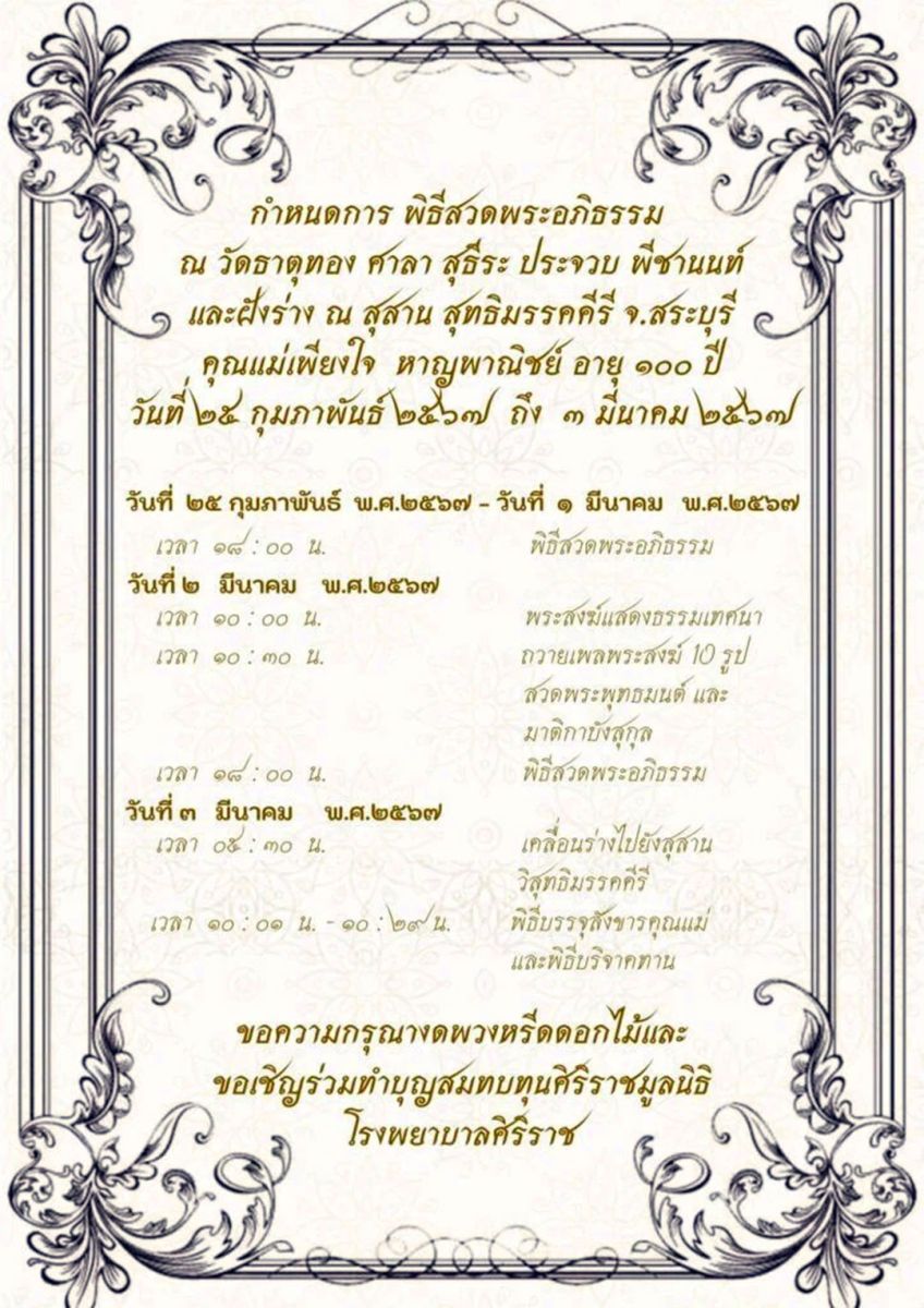 โดยวันที่ 2 มีนาคม เวลา 10.00 น.พระสงฆ์แสดงพระธรรมเทศนา เวลา 10.30 น.ถวายเพลพระสงฆ์ 10 รูป สวดพระพุทธมนต์ และมาติกาบังสุกุล เวลา 18.00 น.พิธีสวดพระอภิธรรม วันที่ 3 มีนาคม เวลา 05.30 น.เคลื่อนร่างไปยังสุสานวิสุทธิมรรคคีรี เวลา 10.01 – 10.29 น.พิธีบรรจุสังขารคุณแม่ และพิธีบริจาคทาน ทางเจ้าภาพขอความกรุณางดพวงหรีดดอกไม้ และขอเชิญร่วมทำบุญสมทบทุนศิริราชมูลนิธิ โรงพยาบาลศิริราช