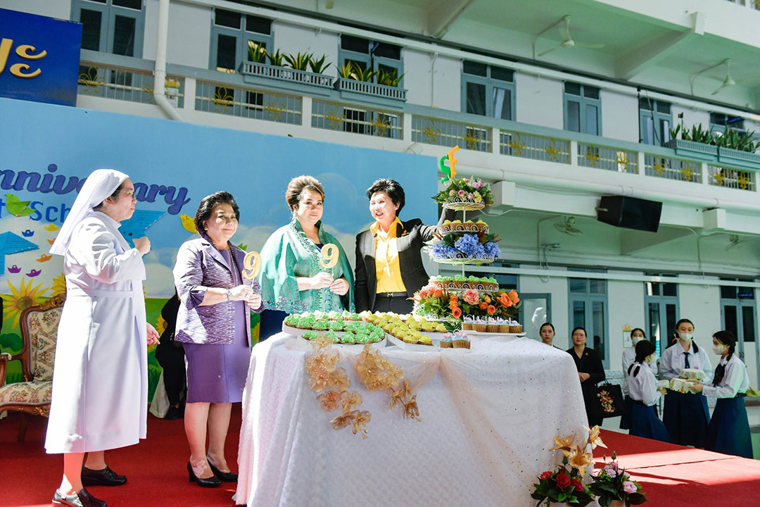 ในตอนท้าย ดร.พวงเพ็ชร ชุนละเอียด, ศุภมาส อิศรภักดี และดร.ศศมณฑ์ สงวนสิน ร่วมกันปักอักษร “SF 99” บนชั้นวางคัพเค้ก โดยมีนักเรียนร่วมร้องเพลง “Happy Foundation Day” ต่อด้วยการแสดง 4 ชุด ได้แก่ ชุด “Hail Holy Queen”, ชุด “Pass the Love Forward”, ชุด “ดอกไม้ของชาติ” ของนักเรียน ป.6 จำนวน 211 คน, ชุด “คีตะมวยไทย” ของนักเรียน ป.5 จำนวน 225 คน