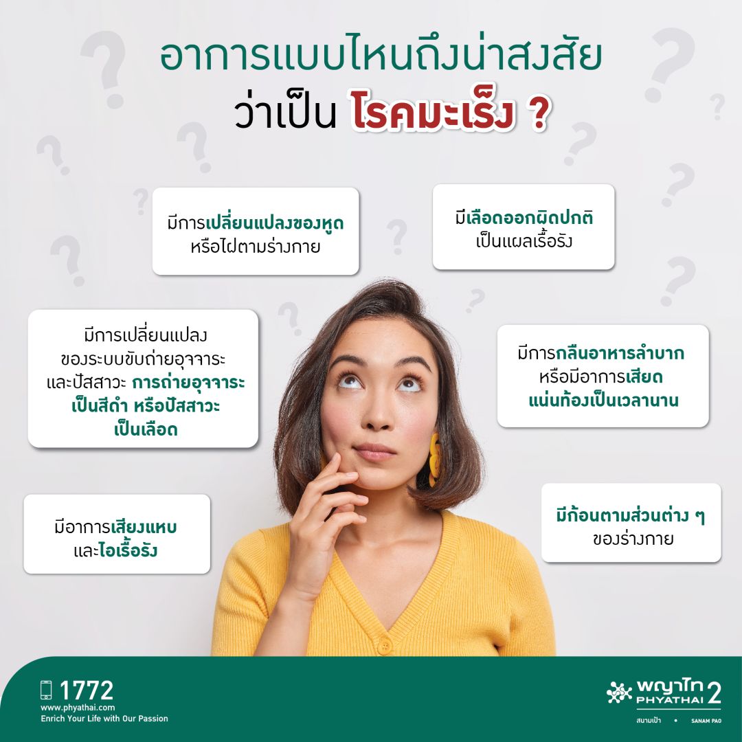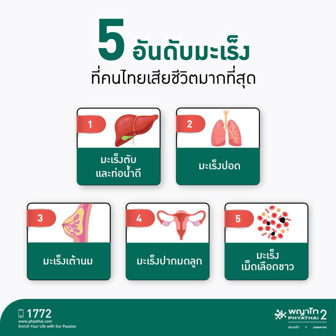 ทำไมต้องรอให้สงสัยว่าเราเสี่ยงเป็นมะเร็งหรือไม่? โรงพยาบาล พญาไท 2 สนับสนุนการรณรงค์เดือนแห่งการตระหนักถึง “โรคมะเร็ง” เพื่อให้คนทั่วโลกเล็งเห็นความสำคัญในการใส่ใจและป้องกันโรคมะเร็งก่อนจะเกิดอาการน่าสงสัย ซึ่งในปัจจุบัน โรคมะเร็ง นับเป็นโรคที่เป็นสาเหตุการเสียชีวิตอันดับหนึ่งของคนไทย และเป็นสาเหตุการเสียชีวิตอันดับต้น ๆ ของคนทั่วโลก สำหรับประเทศไทย จากสถิติโรคมะเร็งของสถาบันมะเร็งแห่งชาติ พบว่า แต่ละปีมีคนไทยป่วยเป็นมะเร็งรายใหม่ประมาณ 140,000 คน เสียชีวิตประมาณ 83,000 คน โดยโรคมะเร็งที่เป็นสาเหตุการเสียชีวิตของคนไทย 5 อันดับแรก คือ
