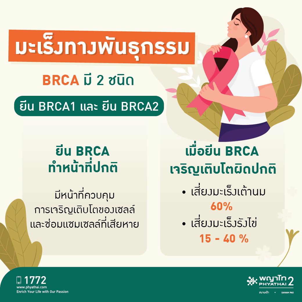 ความเสี่ยงในการเป็นโรคมะเร็งทางพันธุกรรม และหากพบว่าคนไข้มีความเสี่ยงจากประวัติครอบครัว แพทย์จึงทำการตรวจเลือดหายีนมะเร็งทางพันธุกรรมเพื่อยืนยันอีกครั้งว่าคนไข้มีสิทธิ์เป็นโรคมะเร็งชนิดใดได้บ้าง จากนั้นแพทย์จะทำการตรวจยีน 2 กลุ่ม คือยีน BRCA1 และ ยีน BRCA2 ซึ่งทำหน้าที่ควบคุมการเจริญเติบโตของเซลล์ หากพบว่ายีนทั้ง 2 กลุ่มนี้มีความผิดปกติ นั่นหมายความว่ามีโอกาสเกิดโรคมะเร็งและสามารถสืบทอดทางพันธุกรรมได้นั่นเอง