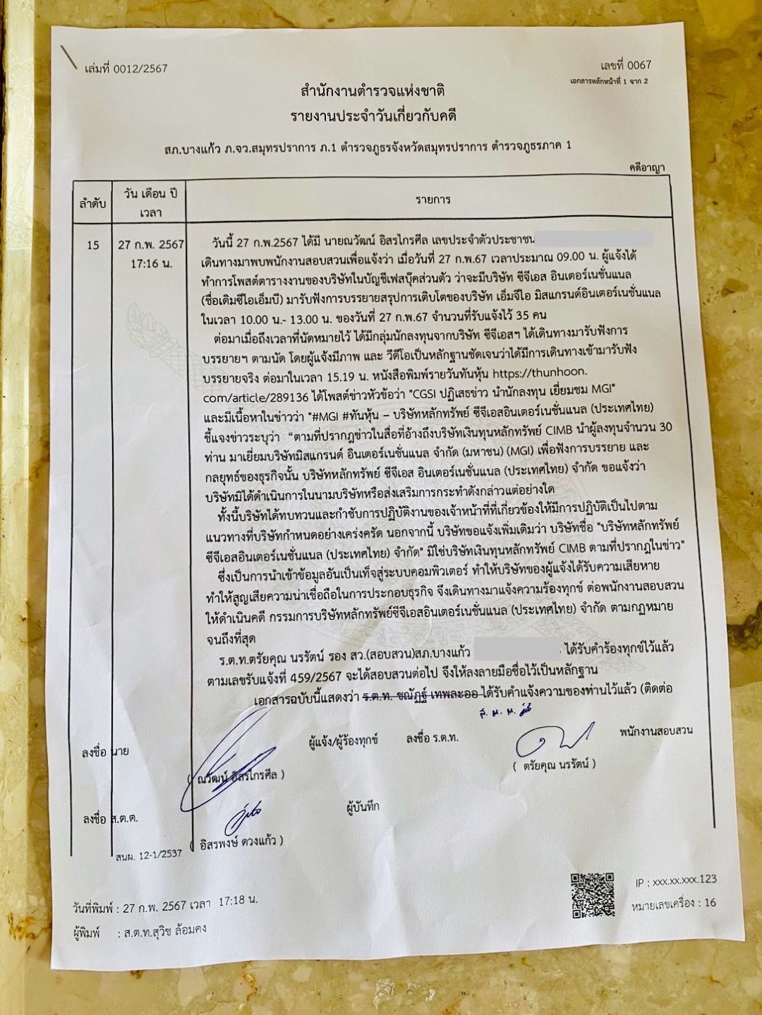 ความคืบหน้าจากเหตุการณ์ นายณวัฒน์ อิสรไกรศีล ประธานและเจ้าหน้าที่บริหาร บริษัท มิสแกรนด์ อินเตอร์เนชั่นแนล จำกัด (มหาชน) หรือ MGI เข้าพบพนักงานสอบสวน สน.บางแก้ว ต.บางแก้ว เมื่อช่วงเย็นวานนี้ (27 กุมภาพันธ์ 2567) แจ้งความเอาผิดคู่กรณี หลังได้รับความเสียหายและเสื่อมเสียชื่อเสียง ทำให้ขาดความน่าเชื่อถือในทางธุรกิจจากการเผยแพร่ข้อมูลอันเป็นเท็จจากบริษัทหลักทรัพย์ซีจีเอสอินเตอร์เนชั่นแนล(ประเทศไทย)หรือCGSIผ่านหนังสือพิมพ์รายวันทันหุ้น https://thunhoon.com/article/289136 ซึ่งโพสต์ข่าวหัวข้อว่า “CGSI ปฏิเสธข่าว นำนักลงทุน เยี่ยมชม MGI” โดยมีเนื้อหาในข่าวว่า “#MGI #ทันหุ้น – บริษัทหลักทรัพย์ ซีจีเอสอินเตอร์เนชั่นแนล (ประเทศไทย) ชี้แจงข่าวระบุว่า “ตามที่ปรากฏข่าวในสื่อที่อ้างถึงบริษัทเงินทุนหลักทรัพย์ CIMB นำผู้ลงทุนจำนวน 30 ท่าน มาเยี่ยมบริษัทมิสแกรนด์ อินเตอร์เนชั่นแนล จำกัด (มหาชน) (MGI) เพื่อฟังการบรรยาย และกลยุทธ์ของธุรกิจนั้น บริษัทหลักทรัพย์ ซีจีเอสอินเตอร์เนชั่นแนล (ประเทศไทย) ขอแจ้งว่า บริษัทมิได้ดำเนินการในนามบริษัทหรือส่งเสริมการกระทำดังกล่าวแต่อย่างใด