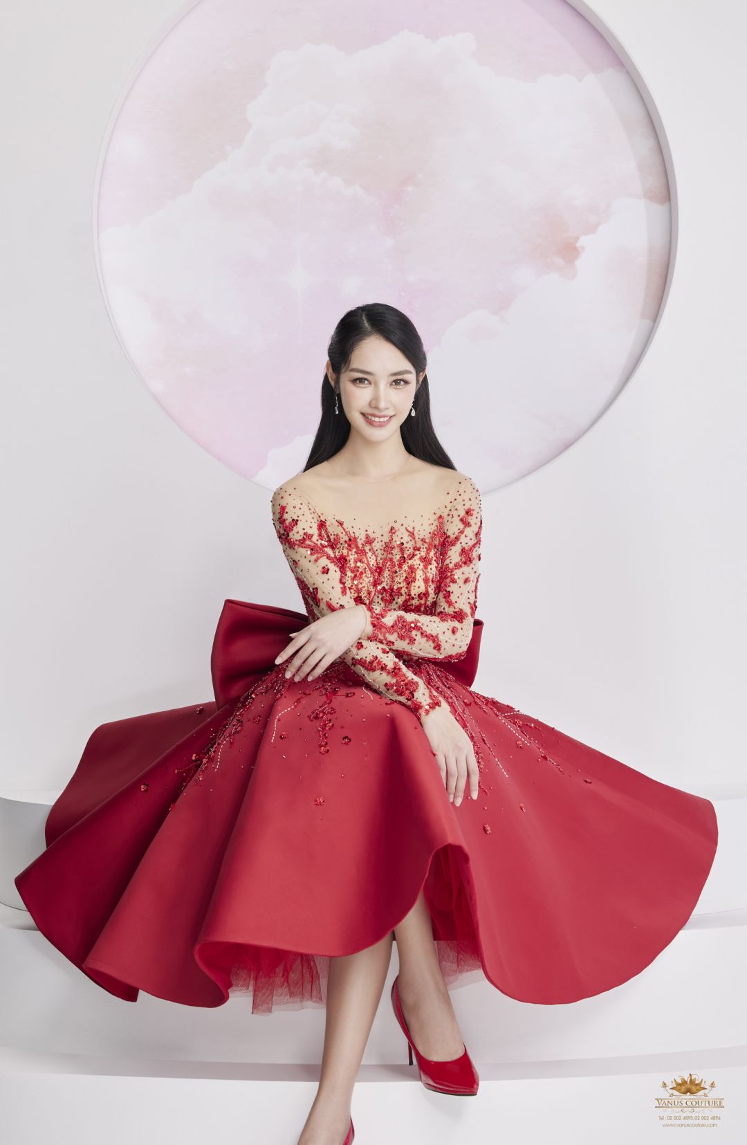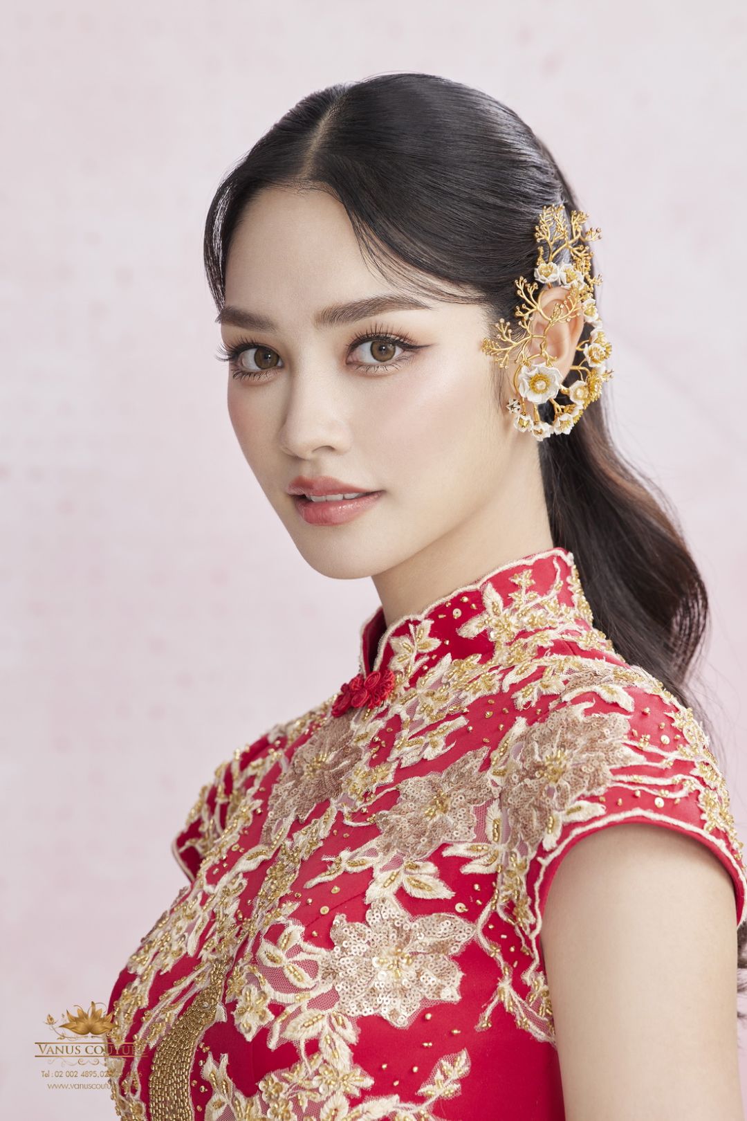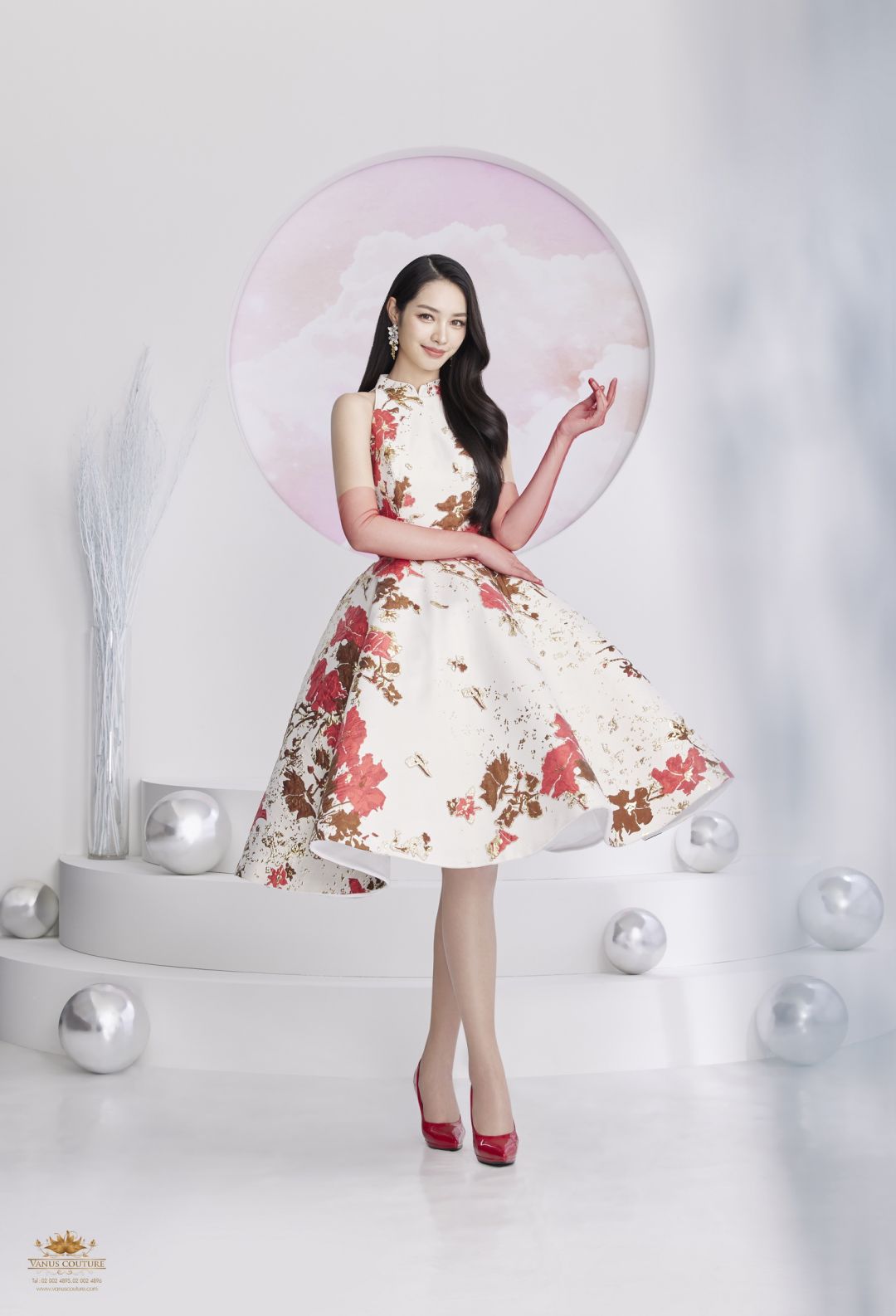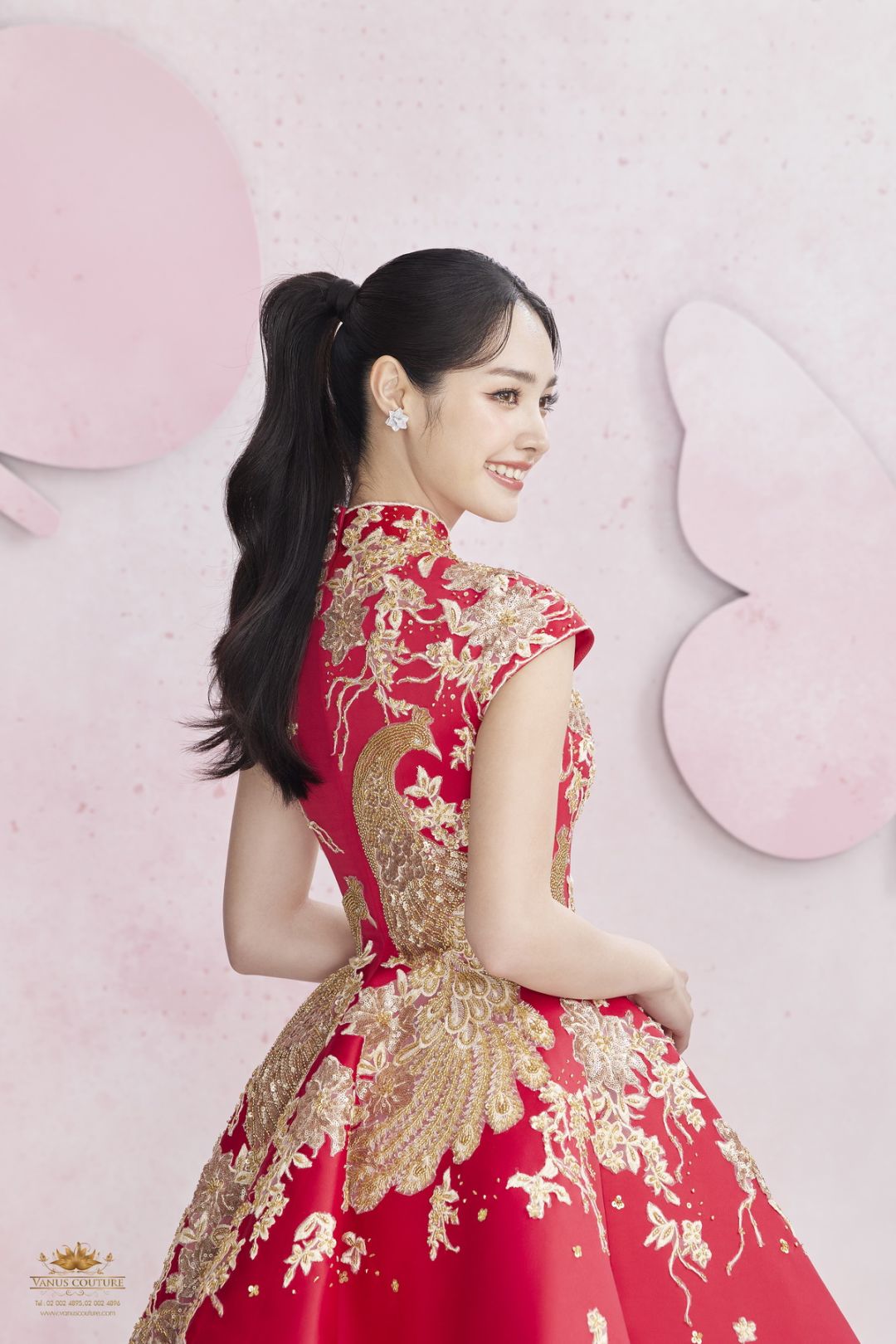 ปิดท้ายด้วย ชุดยกน้ำชาชุดที่ 10 สีแดงลายหงส์สีทองคำ ตัวเสื้อเป็นผ้าไหมซาตินสีแดงสด แขนล้ำช่วยให้ลำแขนของผู้สวมใส่ให้ดูเรียวและเล็กลง ตัวเสื้อวางด้วยลูกไม้นำเข้าและปักด้วยสวารอฟสกี้นำเข้าจากประเทศออสเตรียสีทองคำระยิบระยับจับตา ออกแบบและวาดลวดลายของดอกไม้และหงส์จีนสีทองคำ ซึ่งเป็นสัญลักษณ์ของความสมบูรณ์แบบ และความบริสุทธิ์