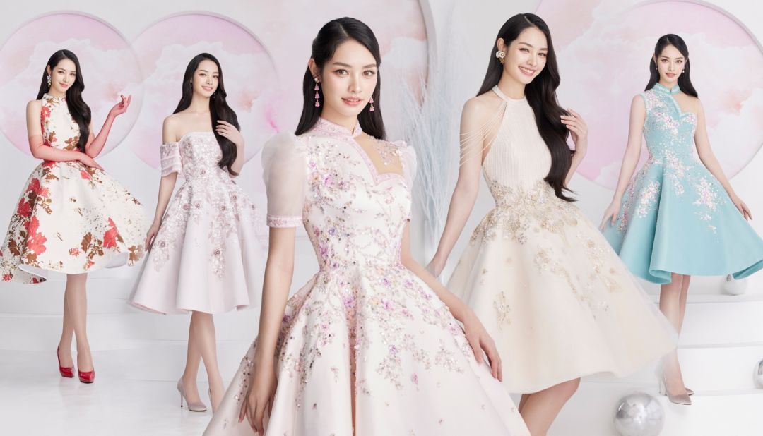 ชุดที่ 5 ชุดยกน้ำชาสีชมพูอ่อน ตัวเสื้อตัดเย็บด้วยผ้าไหมซาตินเนื้อละเอียดมันวาวเล็กน้อยแบบละมุนละไม คอเสื้อเป็นแบบคล้องคอทรงกี่เพ้าแบบจีนดั้งเดิมผสมผสานความเป็นจีนร่วมสมัย ประดับตกแต่งด้วยตุ้งติ้งคริสตัลเพชรใสแบบไล่ระดับโอบอำพลางต้นแขน ตัดเย็บด้วยแพทเทิร์น แบบฝรั่งเศส มีการใส่โครงอ่อนในชุดช่วยให้บีบรัดทรวดทรงให้ผู้ที่สวมใส่ชุดนี้มี อก เอว และสะโพก ที่งดงาม ตัวผ้ามีลวดลายและสีสันที่สื่อถึงความเป็นมงคล มีสีชมพูอ่อนและสีขาวของดอกเหมยนำมาร้อยเรียงจัดวางได้อย่างลงตัวและงดงาม