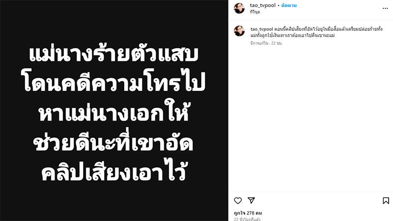 วันที่ 11 มีนาคม 2567 มีเรื่องให้เผือกกันอีกแล้ว เมื่อ เต๋า ทีวีพูล ก็ออกมาโพสต์ข้อความปริศนากลางโซเชียล ระบุว่า “แม่นางร้ายตัวแสบ โดนคดีความโทรไปหาแม่นางเอกให้ช่วย ดีนะที่เขาอัดคลิปเสียงเอาไว้ ” พร้อมทั้งยังระบุข้อความเพิ่มเติมอีกด้วยว่า