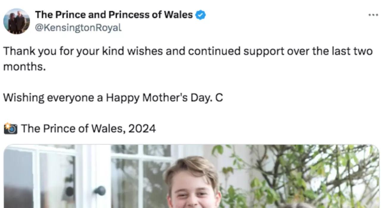 ทั้งนี้ ภาพถ่ายดังกล่าว ถูกโพสต์ลงในแอ็กเคานต์ทางการของเจ้าชายและเจ้าหญิงแห่งเวลส์ใน เอ็กซ์ เมื่อวันอาทิตย์ที่ผ่านมา พร้อมข้อความระบุว่า ขอขอบคุณสาธารณชนที่แสดงความห่วงใย และให้การสนับสนุนทั้งสองพระองค์ตลอด 2 เดือนที่ผ่านมา และขออำนวยพรให้ทุกคนมีความสุขเนื่องในวันแม่