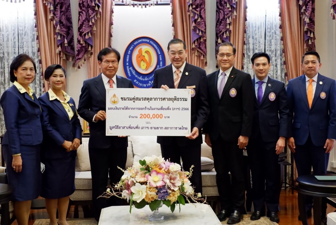 เมื่อเวลา 15.30 น. วันที่ 12 มีนาคม 2567 ชมรมคู่สมรสตุลาการศาลยุติธรรม นำโดย คุณจรูญ ชีวิตโสภณ ประธานชมรมคู่สมรสตุลาการศาลยุติธรรม และคณะ เข้ามอบเงินจากการจัดงานเพื่อนพึ่ง (ภาฯ) 2566 จำนวน 200,000 บาท เพื่อสมทบทุนมูลนิธิอาสาเพื่อนพึ่ง (ภาฯ) ยามยาก สภากาชาดไทย ในการช่วยเหลือผู้ประสบอุทกภัย โดยมี ศาสตราจารย์พิเศษ ดร.สุรเกียรติ์ เสถียรไทย รองประธานกรรมการที่ปรึกษาและประธานกรรมการบริหารมูลนิธิฯ พร้อมด้วยคณะกรรมการมูลนิธิฯ เป็นผู้รับมอบ ณ อาคารมหินทรเดชานุวัตน์ สำนักงานมูลนิธิอาสาเพื่อนพึ่ง (ภาฯ) ยามยาก สภากาชาดไทย ถนนเพชรบุรี