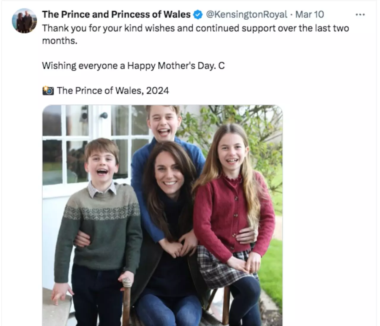 ปรากฏว่าเมื่อวันที่ 10 มีนาคม 2567 ทางสำนักพระราชวังเคนซิงตันในกรุงลอนดอนได้เผยแพร่พระรูปครอบครัวของเจ้าหญิงแคเธอรีน หรือเจ้าหญิงเคท ที่ได้ฉายพระรูปกับเจ้าชายจอร์จ เจ้าหญิงชาร์ลอตต์ และเจ้าชายลูอิส เนื่องในวันแม่ ซึ่งนับเป็นการเผยแพร่พระรูปของเจ้าหญิงเคทอย่างเป็นทางการครั้งแรก นับตั้งแต่ทรงเข้ารับการผ่าตัดช่องท้อง