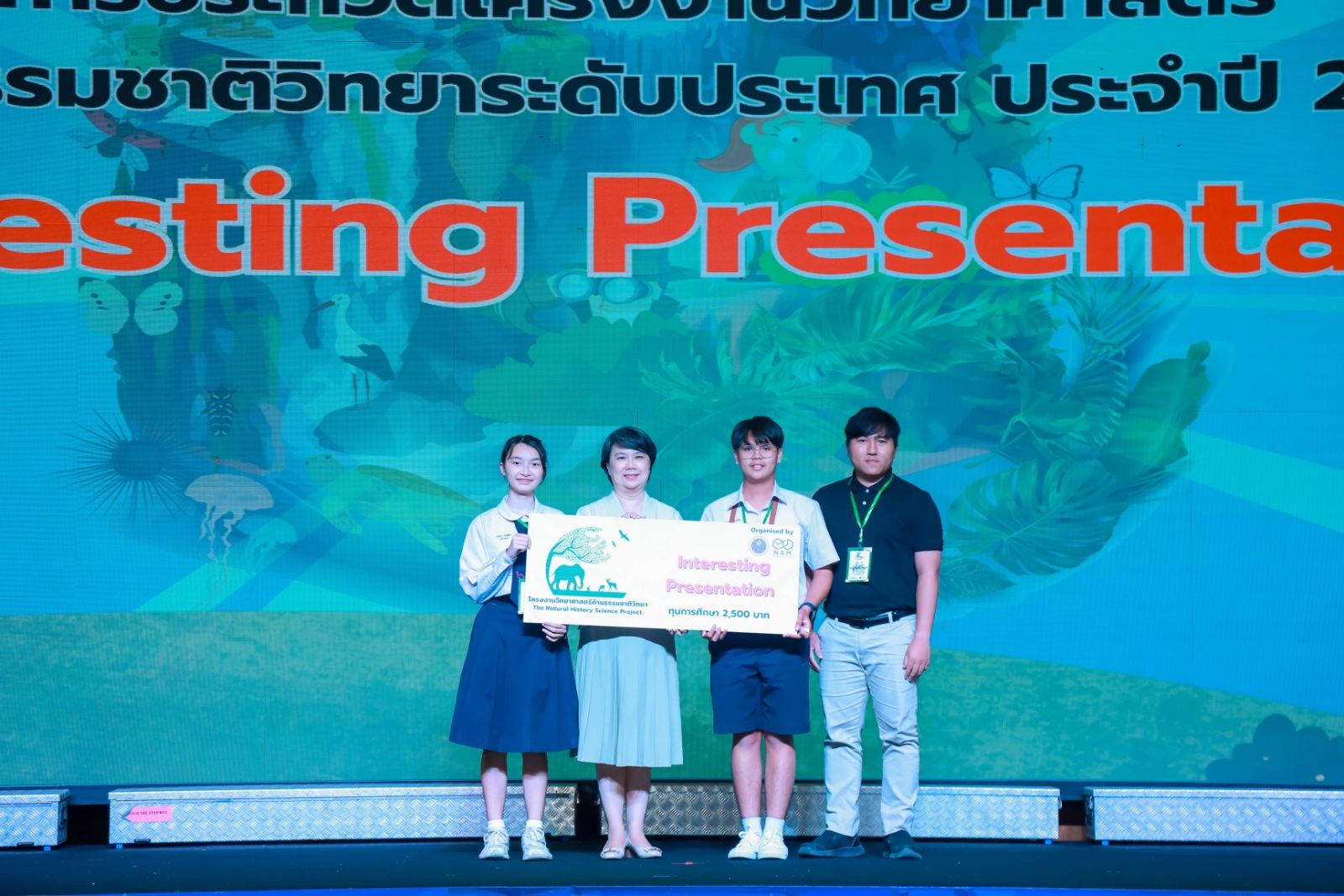 รางวัล Interesting presentation ได้แก่ ทีมโรงเรียนองค์การบริหารส่วนจังหวัดเชียงราย กับ โครงงาน “การศึกษาความหลากหลายของนกและปัจจัยที่มีผลต่อการเลือกอาศัยของนกนางแอ่นอพยพในบริเวณตัวเมืองเชียงราย” สมาชิกในทีม ได้แก่ นายญาณกร พัฒนเชียร ด.ญ.นาโอมิ เงินท๊อก และนายปฏิญาณ จิตร์ลัดดา ครูที่ปรึกษา