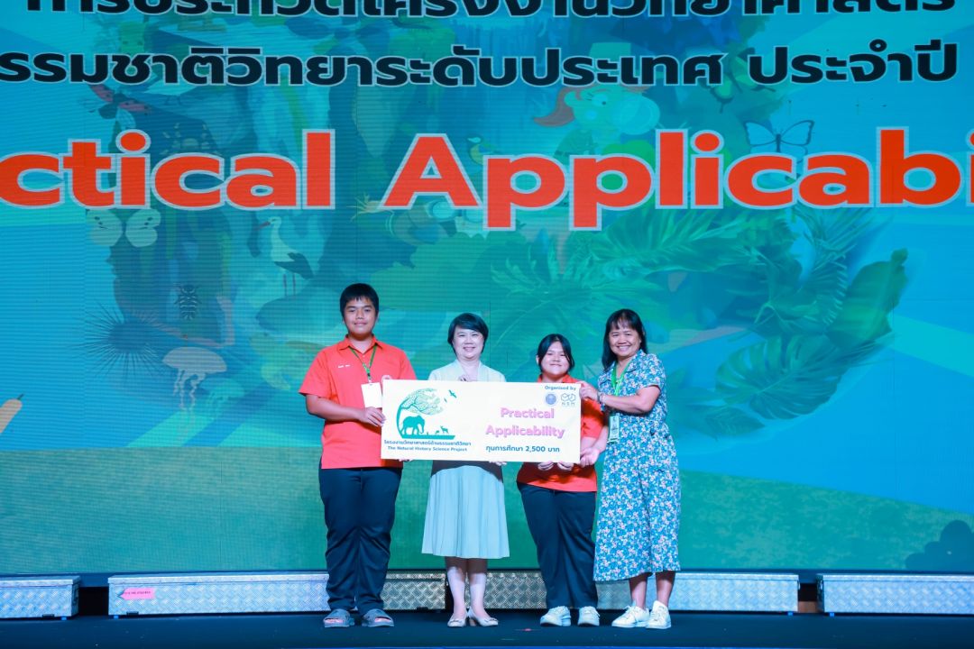 รางวัล Practical applicability ได้แก่ ทีมโรงเรียนพิชัยรัตนาคาร จ.ระนอง กับ โครงงาน “การศึกษาความหลากชนิดและความชุกชุมของปูแสมในพื้นที่ป่าชายเลน จังหวัดระนอง” สมาชิกในทีม ได้แก่ ด.ช.จักรภพ รูปคม ด.ญ.ธมกร เอี่ยวสกุล และนางนภัสกร ฟองฟุ้ง ครูที่ปรึกษา