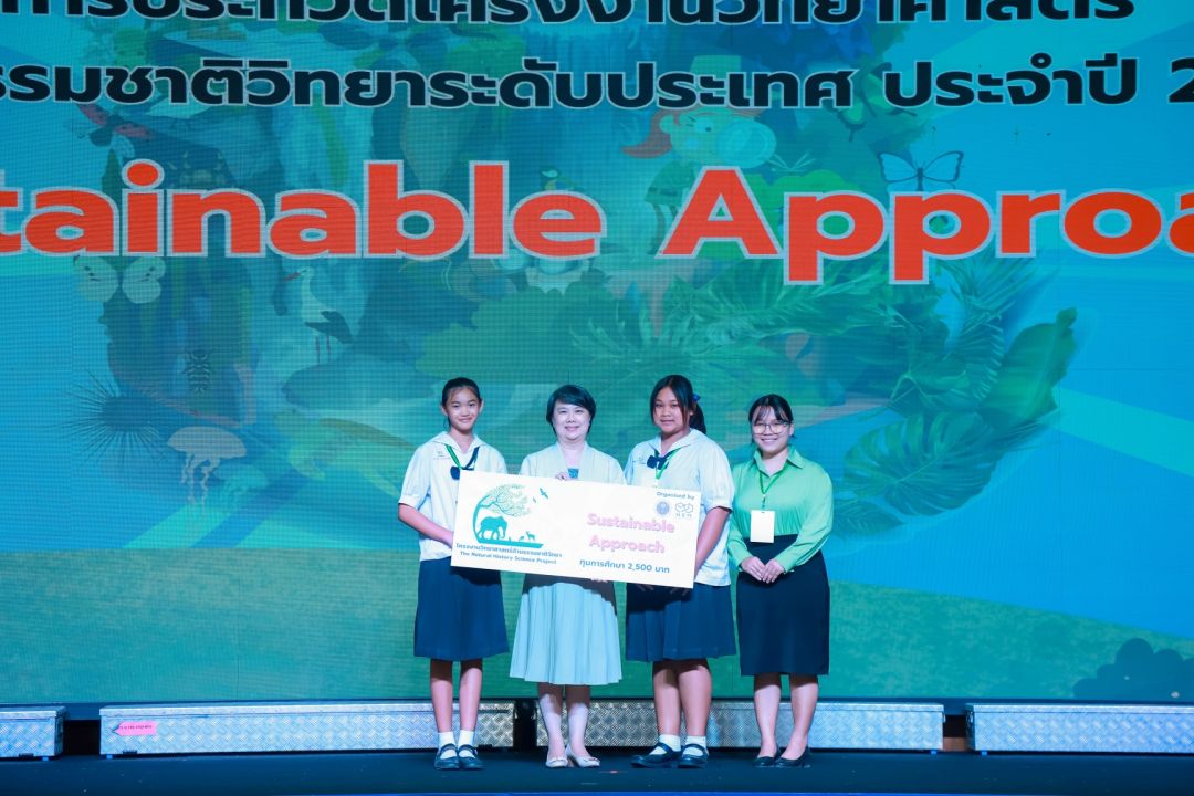 รางวัล Sustainable approach ได้แก่ ทีมโรงเรียนเพชรวิทยาคาร จ.ชัยภูมิ กับ โครงงาน “การสำรวจและรวบรวมรายชื่อพืชสมุนไพรเพื่อใช้เป็นฐานข้อมูลและการใช้ประโยชน์อย่างยั่งยืนในพื้นที่ตำบลบ้านเพชร อำเภอภูเขียว จังหวัดชัยภูมิ” สมาชิกในทีม ได้แก่ ด.ญ.นันทิญา โคตรภูเขียว ด.ญ.ทักษอร รัตนประทุม และนางสาวจณิสตา ประหยัดทรัพย์ ครูที่ปรึกษา
