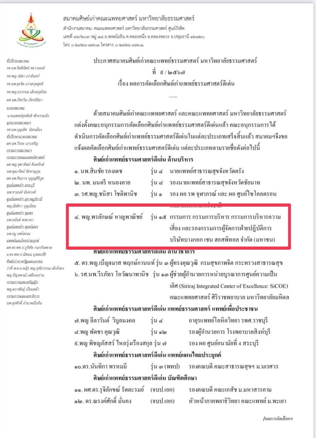 19 มีนาคม 2567 สมาคมศิษย์เก่าคณะแพทยศาสตร์ มหาวิทยาลัยธรรมศาสตร์ จัดงานมอบรางวัลศิษย์เก่าแพทย์ธรรมศาสตร์ดีเด่น ผลปรากฎว่า “พญ.พรลักษณ์ หาญพาณิชย์” รองกรรมการผู้จัดการ บริษัทบางกอกเชนฮอสพิทอลจำกัด(มหาชน) คว้ารางวัลศิษย์เก่าแพทย์ธรรมศาสตร์ดีเด่นด้านบริหาร