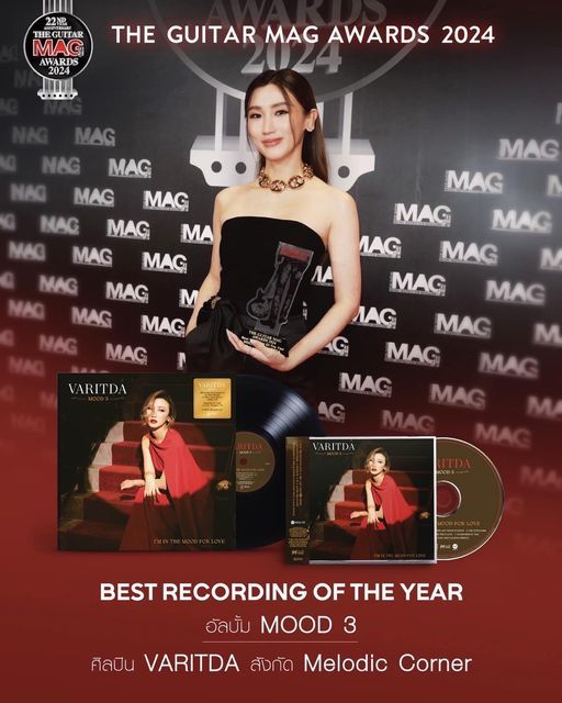 ผ่านไปแล้วสำหรับค่ำคืนสุดพิเศษ กับงานประกาศรางวัลของคนดนตรีแห่งปี “The Guitar Mag Awards2024”ที่ส่งให้ ‘VARITDA’(วา-ริด-ดา) หรือ อุ๋ม-วฤตดา ภิรมย์ภักดีศิลปินสาวเสียงสวยผู้ขับร้องเพลงแจ๊สที่มีเอกลักษณ์ ในสังกัดค่ายเมลอดิก คอนเนอร์ (Melodic Corner)ภายใต้บริษัท มิวซิกมูฟ จำกัด ขึ้นรับรางวัลใหม่ ในสาขาBest Recording Of The Year2024ที่มอบให้กับอัลบั้มที่มีการบันทึกเสียงคุณภาพยอดเยี่ยมที่สุดแห่งปีจากผลงานอัลบั้ม Mood 3 : I’m In The Mood For Loveพร้อม Producer คู่ใจ‘บอม-พัชรพงศ์ จันทาพูน’ถือเป็นอีกโมเมนต์สำคัญในค่ำคืนวันที่ 12 มีนาคม 2567 ณTrue Icon Hall atICONSIAM
