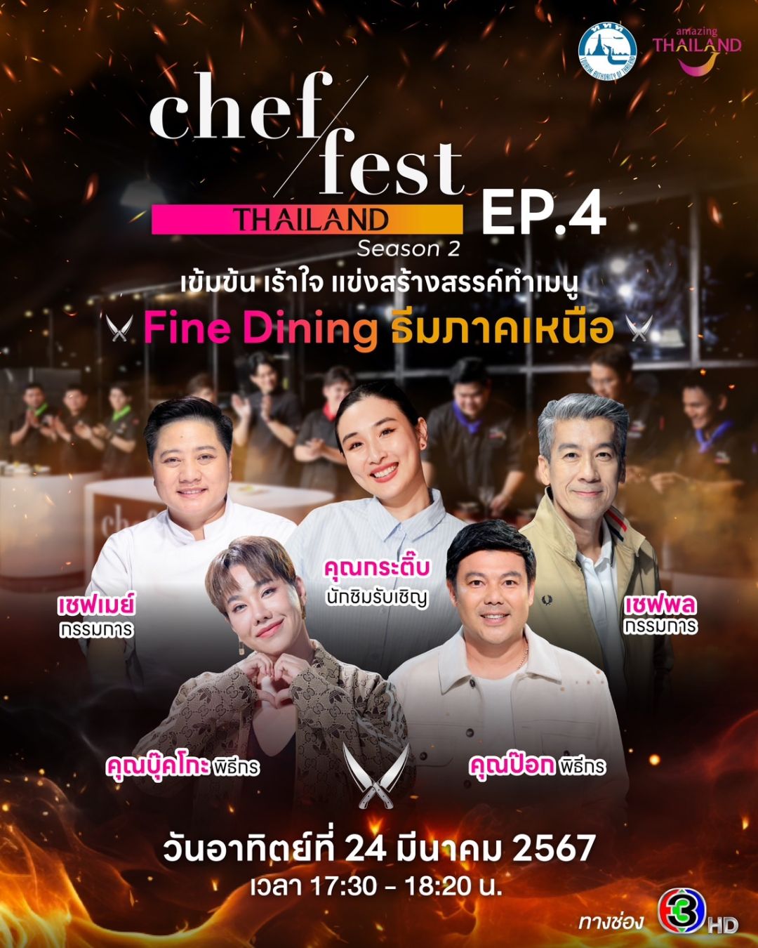 รายการ “Chef Fest Thailand season 2”พิธีกร พี่ป็อก กิตติพันธ์ จะพาทุกคนขึ้นเหนือไปค้นหาวัตถุดิบสุด Unseen ที่จะมาเป็นโจทย์ในการแข่งขันกันใน EP.4 กับโจทย์วัตถุดิบภาคเหนือ เชฟที่ผ่านเข้ารอบจะต้องรังสรรค์เมนูตามโจทย์ที่ได้รับและต้องเอาชนะใจคณะกรรมการทั้ง 3 ท่าน เชฟเมย์ พัทธนันท์ , เชฟพล ตัณฑเสถียร และ กระติ๊บ ชวัลกร เซเลบริตี้นักชิมความยากของ EP.นี้นอกจากวัตถุหลักภาคเหนือแล้ว ยังมี เชฟเมย์ เชฟใหญ่ประจำรายการ และ กระติ๊บ ชวัลกร เป็นคนเหนืออีกด้วยมาติดตามกันว่าเชฟผู้เข้าแข่งขันทีมไหนผลงานจะถูกใจคณะกรรมการมากที่สุดมาติดตามกันได้ในรายการ “Chef Fest Thailand season 2” เวลา 17.30 น.