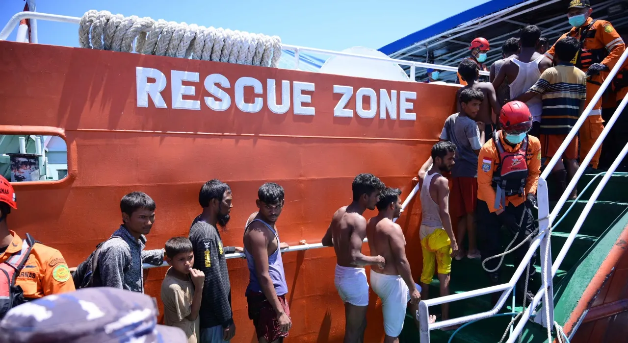 เรือหน่วยกู้ภัยอินโดนีเซียเข้าช่วยเหลือผู้อพยพชาวโรฮีนจาหลายสิบชีวิต หลังเรือไม้ที่โดยสารมาพลิกคว่ำอยู่กลางทะเล จนต้องเกาะเรือนั่งรอคอยความช่วยเหลือนานหลายชั่วโมง