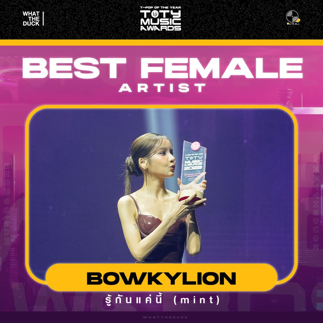 และการันตีความปังต่อเนื่อง โดยเพลง รู้กันแค่นี้ (mint)ของ “Bowkylion”คว้ารางวัลแรกของปี“Best Music of The Year”สาขาFemale ArtistจากเวทีคุณภาพTOTY AWARD 2024 ซึ่งตอกย้ำความสามารถและภาพศิลปินแห่งยุคได้อย่างสมศักดิ์ศรี นอกจาก Bowkylionแล้ว ยังมีอีกหนึ่งรางวัลที่การันตีความสามารถของศิลปินจากค่ายเพลง What The Duckนั่นคือ “ปกป้องจิตดี”พี่ชายนักดนตรีจาก Plastic Plasticคว้ารางวัล Best Producer of the Yearจากเพลงขอไม่เจอเธอ (Wish I Never Met You)จากเวทีนี้เหมือนกัน