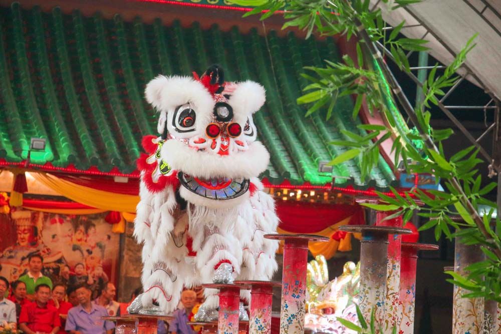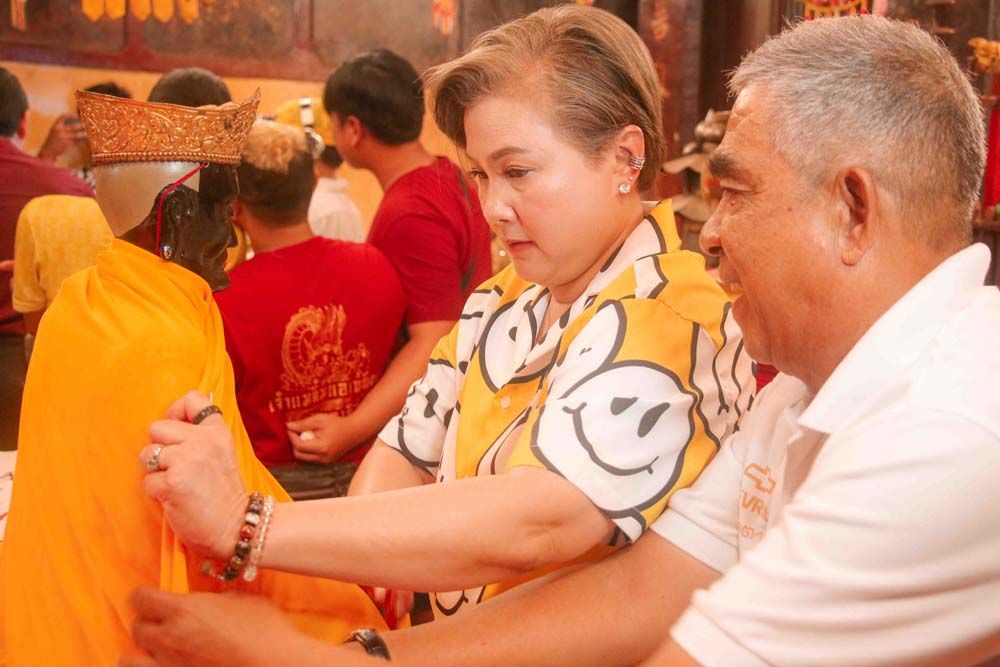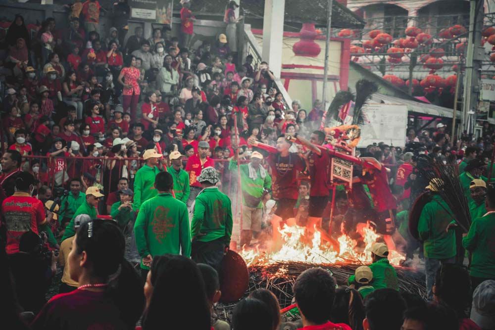 สำหรับพิธีเข้าไฟ…จะมีกองไฟถูกก่อด้วยถ่านไฟรอไว้กลางลานดินหน้าศาลเจ้าฯ สิ่งสำคัญที่ใช้ที่ผ่านพิธีกรรมมาเรียบร้อยประกอบด้วย ทางมะพร้าว เกลือ และข้าวสาร ซึ่งจะมีผู้อาวุโสดูแลและคอยคุมไฟ เมื่อได้เวลาพิธีเข้าไฟเจ้าหน้าที่จะนำน้ำมนต์มารดราดให้ผู้หามเกี้ยวจนชุ่มโชกตัวเพื่อสร้างขวัญและกำลังใจ จากนั้นเกี้ยวพระทั้ง 25 องค์ ก็ถูกหามฝ่าไปในกองไฟด้วยเท้าเปล่า ทุกก้าวเดินลุยเปลวไฟเต็มไปด้วยพลังศรัทธาอันแน่วแน่…โดยเฉพาะเมื่อถึงลำดับเกี้ยวเจ้าแม่ลิ้มกอเหนี่ยว ผู้คนที่ศรัทธาก็เริ่มให้ความสนใจและตั้งจิตขอพรท่านกันจำนวนมาก ซึ่งการหามเกี้ยวพระลุยไฟนี้ เชื่อกันว่าไฟจะช่วยปัดเป่าเคราะห์ร้ายต่างๆ ให้หมดไปและจะมีแต่ความโชคดีตลอดไป หลังพิธีเข้าไฟเสร็จแล้วก็อัญเชิญองค์พระกลับเข้าศาลเจ้าฯ ส่วนกิจกรรมตลอดการจัดงานยังมีมหรสพต่างๆ การประกวดเชิดสิงโตบนเสาดอกเหมยนานาชาติ ซึ่งมีทั้งประเทศจีน เวียดนาม สิงคโปร์ และเมียนมา มาร่วมประกวดด้วย เช้าอีกวันเป็นการถวายและเปลี่ยนชุดใหม่ให้องค์พระ ซึ่งงานนี้คุณน้ำผึ้งได้รับเกียรติให้เป็นผู้ถวายและเปลี่ยนชุดใหม่ให้เจ้าแม่ลิ้มกอเหนี่ยวและพระทุกองค์อีกด้วย