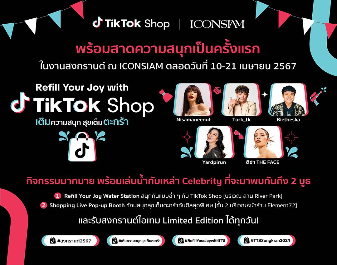 9 เมษายน 2567 TikTok Shop โซลูชั่นอีคอมเมิร์ซชั้นนําในเอเชียตะวันออกเฉียงใต้ ร่วมมือกับ กรุงเทพมหานคร และ ไอคอนสยาม ฉลองเทศกาลแห่งความสุขของคนไทยและนักท่องเที่ยวจากทั่วโลก “Songkran 2024” ขึ้นเป็นมรดกภูมิปัญญาทางวัฒนธรรมที่จับต้องไม่ได้ของโลก จัดกิจกรรม Refill Your Joy with TikTok Shop เติมความสนุก สุขเต็มตะกร้า มอบประสบการณ์ Shoppertainment ส่งความสุขแบบ O2O Live Streaming ชวนเหล่าครีเอเตอร์ใน TikTok กว่า 100 ราย มาร่วม Live Commerce สนับสนุนสินค้าไทยมากมายทั้งสินค้า OTOP ใน TikTok Shop และสินค้าหัตถกรรมสร้างสรรค์ รวมถึงงานศิลป์ฝีมือคนไทยจาก ICONCRAFT มากกว่าร้อยประเภทสินค้า (SKUs) จากร้านค้านับสิบ ๆ ร้าน สร้างปรากฎการณ์ Shoppertainment ในแพลตฟอร์มตลอดเทศกาลมหาสงกรานต์ทั้งที่ ICONSIAM และสยามสแควร์