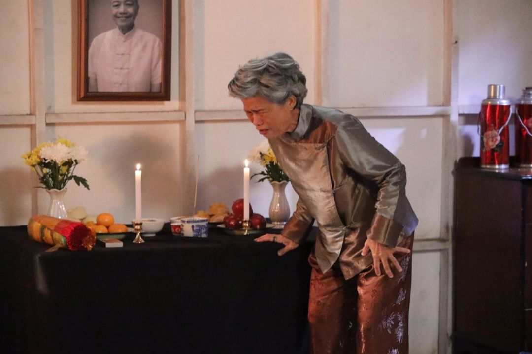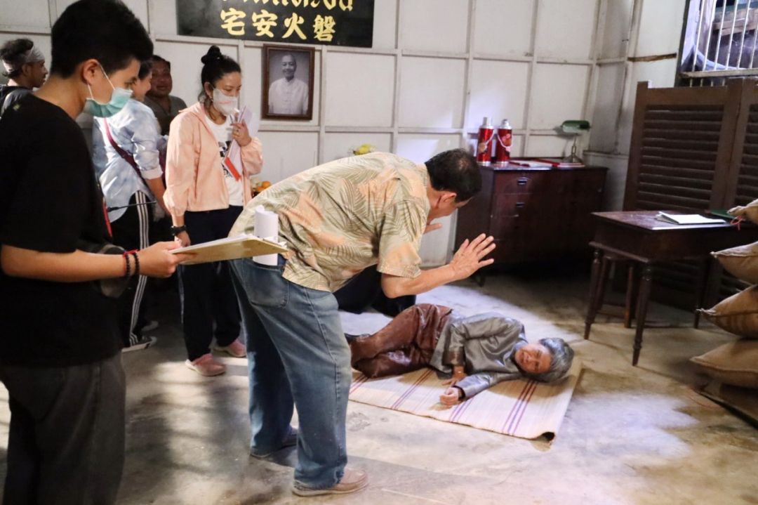 จากนั้นการถ่ายทำก็เริ่มจากฉาก แผน หลอก อาม่า มาทำพิธีที่ห้องทำงานอากง แล้ว แผน ก็ออกไปพร้อมล็อคประตู สักพักก็มีควันและเปลวไฟ อาม่า ร้องเรียกคนช่วย พร้อมทุบประตู แต่ก็ไม่มีใครช่วย เดินมาที่รูป อากง ร้องเรียกให้ช่วย เริ่มสำลักควันไฟอย่างหนัก ก่อนจะล้มหมดสติไป จากนั้น กล้า ก็เปิดประตูเข้า และเห็น อาม่านอนหมดสติอยู่ ก็จะรีบเข้าไปช่วย แต่โดนกระสอบข้าวหล่นลงมาทับ กล้าพยายามจะยกออกแต่ก็ไม่สำเร็จ ได้แต่เอื้อมมือ ส่งเสียงเรียกอาม่า และก็โชคดีที่ เล้ง เข้ามาช่วยก็เลยรีบช่วย อาม่า ออกไปก่อน ในฉากนี้นักแสดงทุกคนเล่นผ่านฉลุยไม่มีเทค ส่วนของไฟก็ได้ภาพตามที่วางไว้