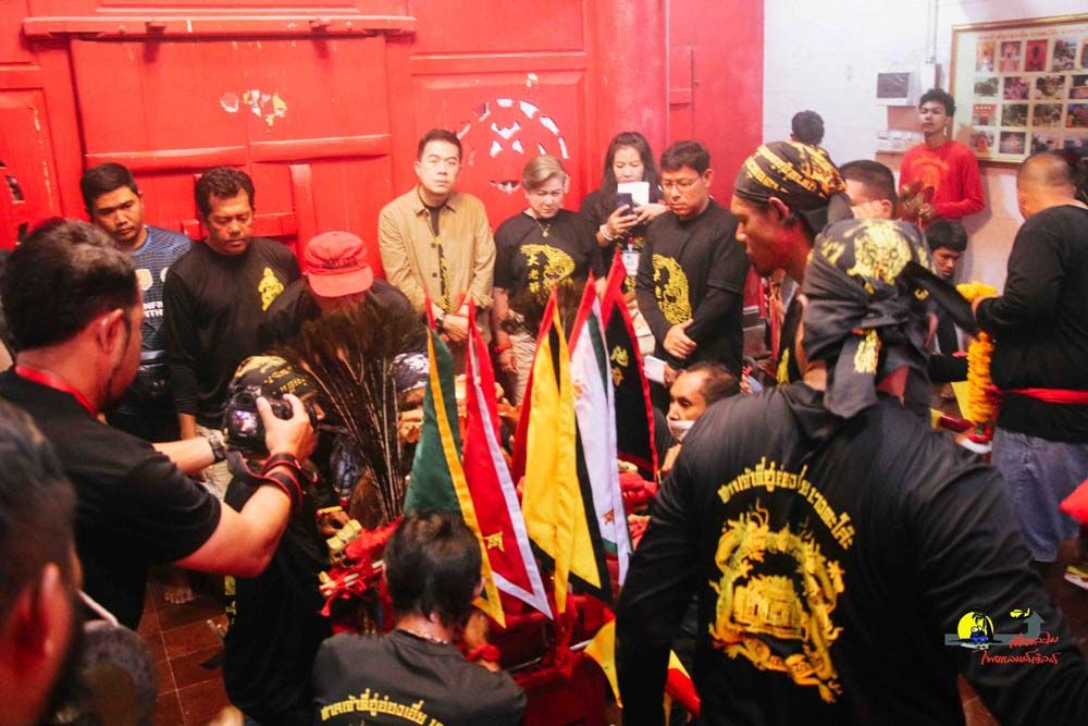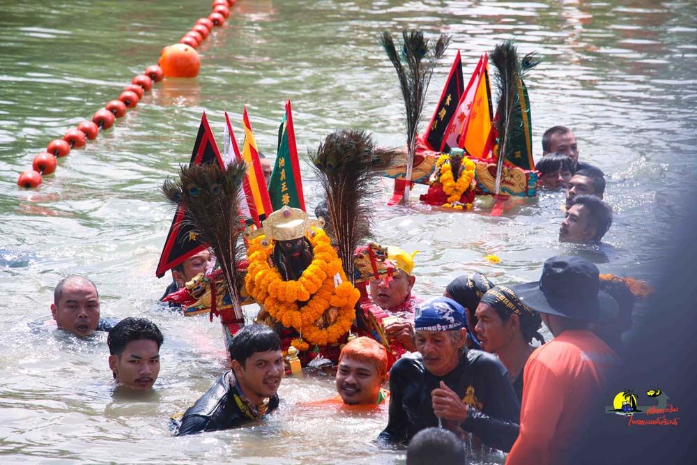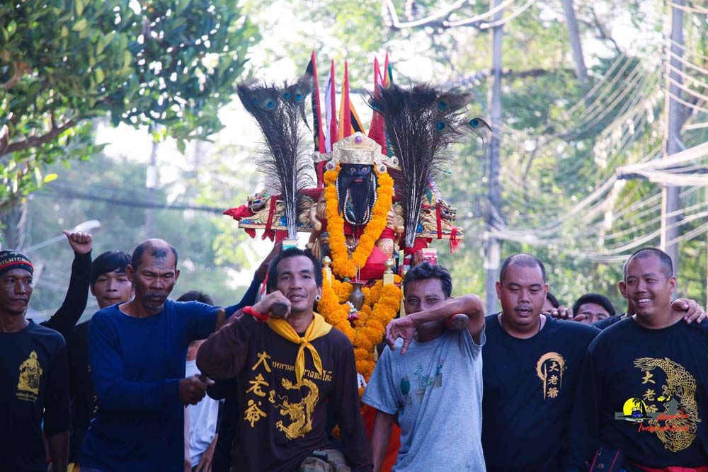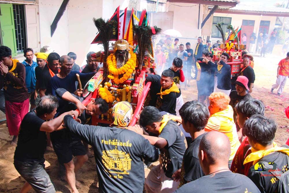 ส่วนพิธีเกี้ยวปักดินของศาลเจ้าตี่ฮู่อ่องเอี่ย…เริ่มจากเชิญองค์พระทั้ง 4 องค์ โดยมีองค์ตี่ฮู่อ่องเอี่ย เป็นพระประธาน ทยอยออกจากศาลเจ้าฯเพื่อให้ลูกหลานชาวบางตะโล๊ะ และชาวตลาดสายบุรีได้กราบไหว้ โดยขบวนมุ่งหน้าไปยังบ้านปากน้ำ, ตลาดสายบุรี ผ่านศาลเจ้าตลาด ก่อนจะไปกันที่ถ้ำปิดคนธรรพ์ บริเวณเทศบาลตำบลตะลุบันที่เรียกว่า…เกี้ยวปักดิน ก็เพราะระหว่างแห่องค์พระออกเยี่ยมลูกหลาน ถ้าท่านพอใจจุดไหน เกี้ยวก็จะโยกและปักลงดินทันที ซึ่งเป็นเอกลักษณ์การหามเกี้ยวที่ไม่เหมือนที่ใดจากนั้นหามเกี้ยวลงทะเล บริเวณชายหาดปาตาบาระต.ปะเสยะวอ และต่อที่พิธีสำคัญอีกอย่างนั่นก็คือ การลุยไฟ เมื่อลุยไฟเสร็จก็จะเป็นการส่งองค์พระกลับเข้าศาลเจ้า
