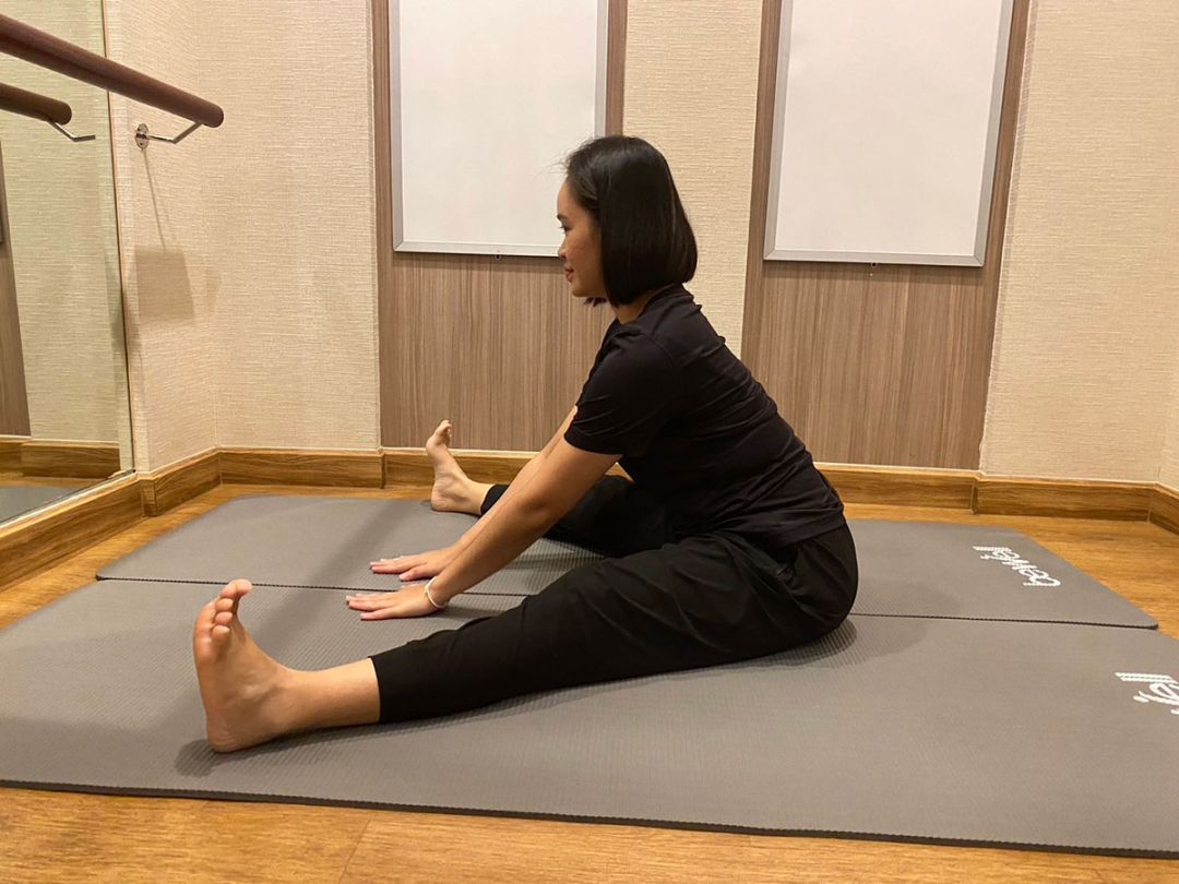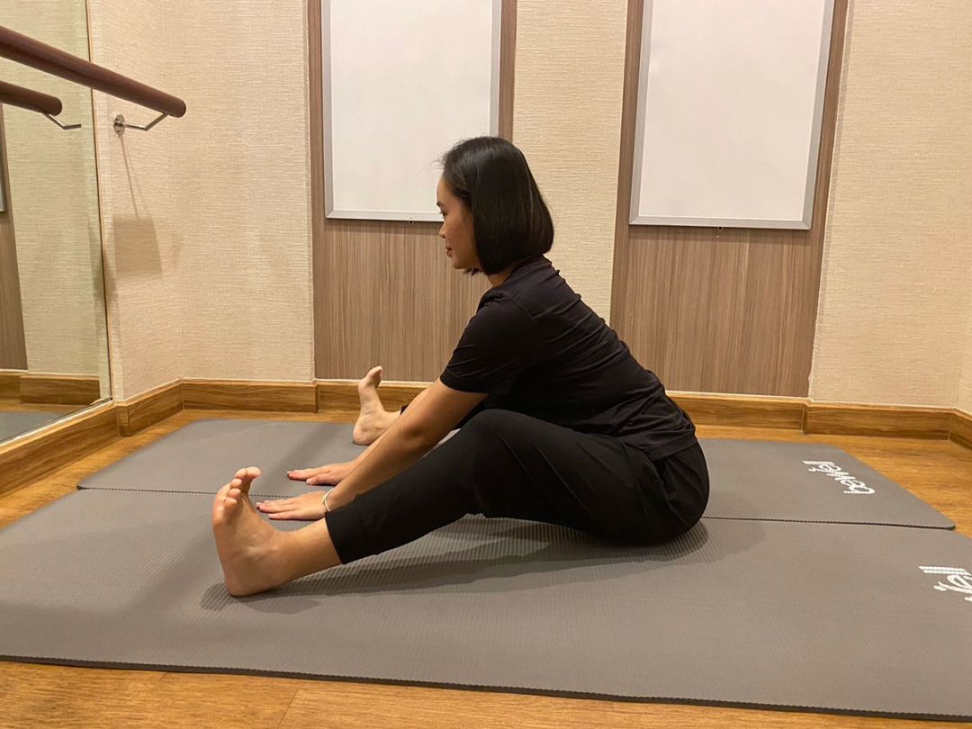 นั่งพื้นเหยียดขาทั้งสองไปด้านหน้า กางขาออกเล็กน้อยยืดหลังตรง งอขาไว้เล็กน้อย กระดกปลายเท้าเข้าหาตัว ไต่มือไปด้านหน้า โดยไม่ให้หลังโก่งงอ ให้จับความรู้สึกเหมือนหลังแอ่น ในขณะที่ก้มหลังลง จนรู้สึกตึงที่ต้นขาด้านหลัง หากยังไม่ตึงให้เหยียดเข่าทั้งสองข้าง หรือก้มหลังมากขึ้น หรือกระดกปลายเท้ามากขึ้นความรู้สึกจะตึงตลอดแนวตั้งแต่ฝ่าเท้า น่อง ข้อพับ ต้นขาด้านหลังจนไปถึงหลัง ทำประมาณ 5 ครั้ง ต่อ 1 set ทำวันละ 3 set