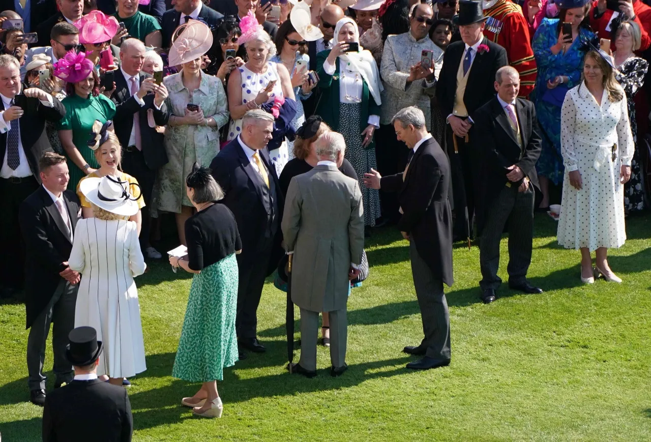 พระเจ้าชาร์ลส์ที่ 3 พร้อมทั้งพระราชินีคามิลลาทรงมีพระราชปฏิสันถารกับแขกเหรื่อที่ได้รับเชิญให้มาร่วมในงานพระราชทานเลี้ยงน้ำชาอย่างอบอุ่นและเป็นกันเอง โดยกษัตริย์ชาร์ลส์ที่ 3 ทรงพระสรวลและตรัสติดตลกกับแขกหลายคน รวมทั้งทรงถามบรรดานักกีฬาว่ายน้ำโอลิมปิกว่าสามารถกลั้นลมหายใจกันได้นานขนาดไหน