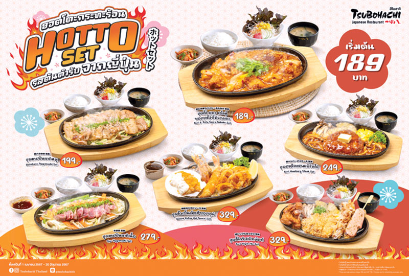 ชวนชิม “Hotto Set” 6 เซตเมนูอร่อยด้วยรสชาติต้นตำรับจากประเทศญี่ปุ่น ราคาเริ่มต้น 189 บาท++ถึง 30 มิ.ย. ที่ ร้านอาหารญี่ปุ่น “สึโบฮาจิ”ทุกสาขา (ยกเว้นสาขาเดอะ พอร์ทอล)