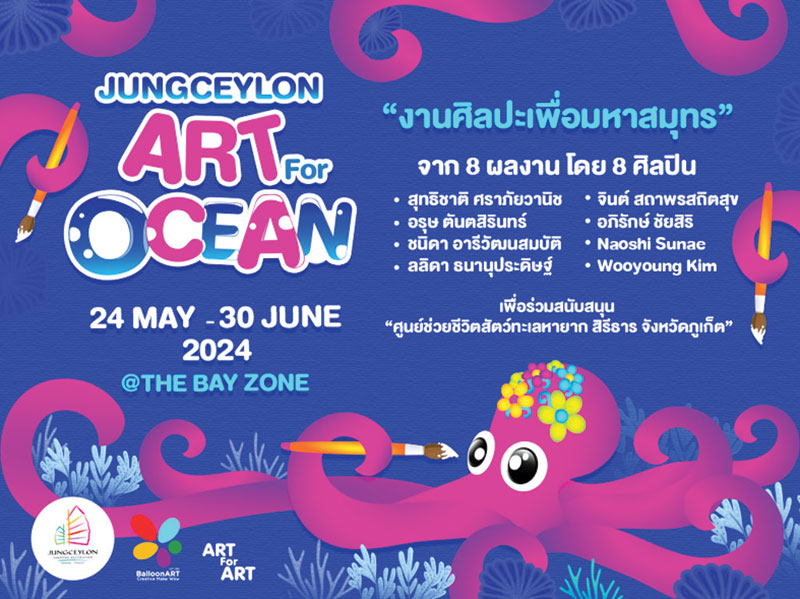 ชวนชม งานศิลปะเพื่อมหาสมุทร ผลงานศิลปะบนหนวดปลาหมึกบอลลูนยักษ์ในงาน “JUNGCEYLON ART FOR OCEAN” 24 พ.ค. ถึง 30 มิ.ย.ที่ศูนย์การค้าจังซีลอนป่าตอง ภูเก็ต โทร.076-600111