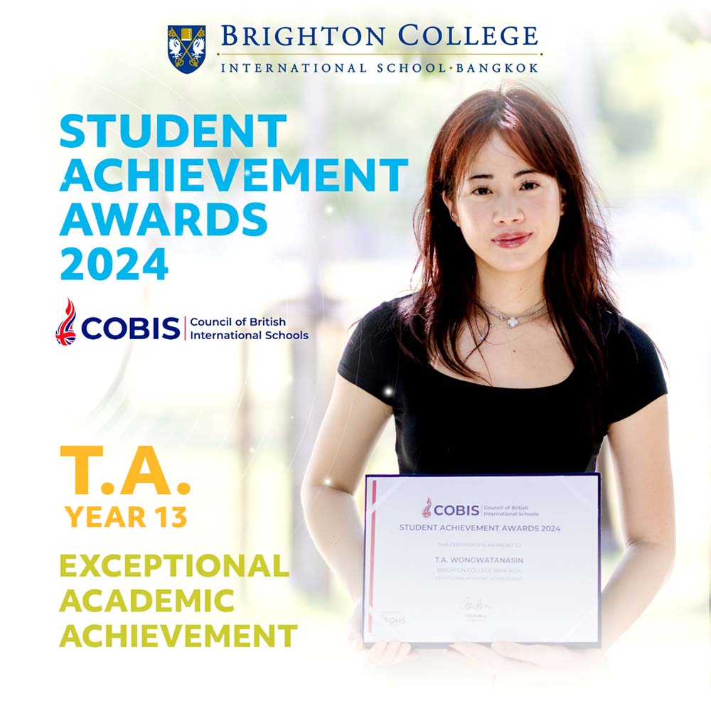 T.A. ได้รับรางวัลจากผลการเรียนที่โดดเด่น ตลอดระยะเวลาที่ T.A. เรียนที่ไบรท์ตันคอลเลจ กรุงเทพฯ ได้แสดงให้เห็นถึงความมุ่งมั่นสู่ความเป็นเลิศทางวิชาการอย่างต่อเนื่องจนประสบความสำเร็จ นอกจากนี้ T.A. ยังได้สร้างแรงบันดาลใจเกี่ยวกับปัญหาที่ส่งผลกระทบต่อสตรีในสังคมผ่าน Podcast และจุดประกายให้เกิดการริเริ่มเรื่องนี้ในโรงเรียนฯ