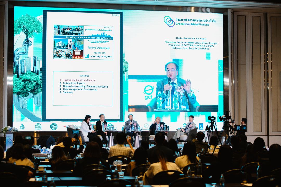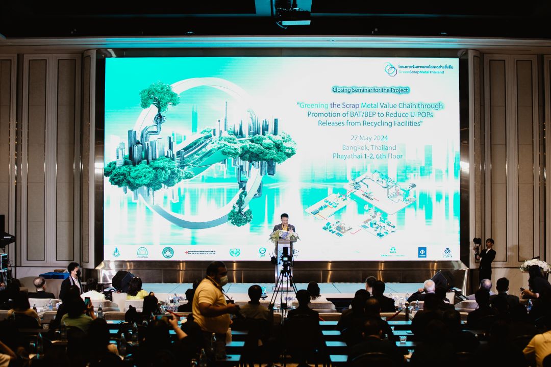 กรมฯ จึงได้ร่วมกับ UNIDO ดำเนินโครงการจัดการเศษโลหะอย่างยั่งยืน (Green Scrap Metal Thailand) โดยนำแนวทางด้านเทคนิคที่ดีที่สุด (Best Available Technique: BAT) และแนวปฏิบัติด้านสิ่งแวดล้อมที่ดีที่สุด (Best Environmental Practice: BEP) ซึ่งเป็นนวัตกรรมและเทคโนโลยีที่มีประสิทธิภาพและเป็นมิตรกับสิ่งแวดล้อมมาพัฒนาอุตสาหกรรมรีไซเคิลเศษโลหะ ลดการปลดปล่อยสารมลพิษ U-POPs เน้นการใช้ทรัพยากรหมุนเวียนที่เป็นมิตรต่อสิ่งแวดล้อม โดยได้รับการสนับสนุนจากกองทุนสิ่งแวดล้อมโลก (GEF) 4.5 ล้านเหรียญสหรัฐ รวมกับการสนับสนุนจากหน่วยงานภาครัฐและภาคเอกชนของไทย คิดเป็นเงินงบประมาณรวม 33.7 ล้านเหรียญสหรัฐ หรือประมาณ 1,100 ล้านบาท ถือเป็นการผนึกกำลังของทุกภาคส่วนเพื่อยกระดับอุตสาหกรรมรีไซเคิลเศษโลหะของไทยตลอดทั้งห่วงโซ่อุปทานให้มีการเติบโตอย่างยั่งยืน จากการดำเนินโครงการอย่างต่อเนื่องตั้งแต่เดือนกันยายนปี 2561 และจะสิ้นสุดภายในปีนี้ รวมเป็นระยะเวลาเกือบ 6 ปี โครงการได้ประสบความสำเร็จและมีผลการดำเนินงานที่สำคัญ เช่น การพัฒนาร่างกรอบนโยบาย กฎหมาย และสิทธิประโยชน์ เพื่อการจัดการเศษโลหะอย่างยั่งยืนในประเทศไทย ซึ่งผ่านการระดมความคิดเห็นจากภาคส่วนที่เกี่ยวข้องแล้ว การพัฒนาฐานข้อมูลห่วงโซ่อุตสาหกรรมรีไซเคิลเศษโลหะของไทย การพัฒนาคู่มือการปฏิบัติงานสำหรับหน่วยงานภาครัฐและผู้ประกอบการ ตลอดจนหลักสูตรการฝึกอบรมให้แก่บุคลากรที่เกี่ยวข้อง กว่า 20 หลักสูตร โดยที่ผ่านมามีผู้เข้ารับการอบรมแล้ว กว่า 3,000 ราย การนำ BAT/BEP ไปใช้จริงในโรงงาน พร้อมสนับสนุนงบประมาณในการลงทุน อัตราส่วน 6:1 รวม 6 โรงงาน โดยสามารถลดการปลดปล่อย U-POPs ได้ปริมาณ 24.0 g WHO-TEQ ต่อปี ซึ่งเกินกว่าค่าเป้าหมาย